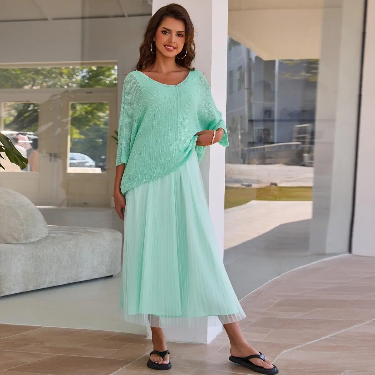 The set is showcased on a model, highlighting its elegance and versatility. Enjoy this fashionable and beautiful two-piece set for your summer adventures!