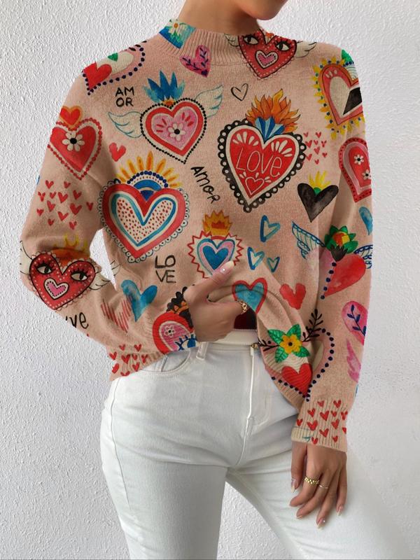 Women's Knitted Sweater, Cartoon Heart Print Design, Casual & Elegant Style, Perfect for Daily Wear, Holiday, Valentine Gift Idea #sweaters #womenssweatshirtset #embroideredsweatshirt #valentinessweatshirts #valentinespajamas #valentinesdaysweater #cozyholidayootd #cutesweater #cozywintermusthave #knitwearfashion