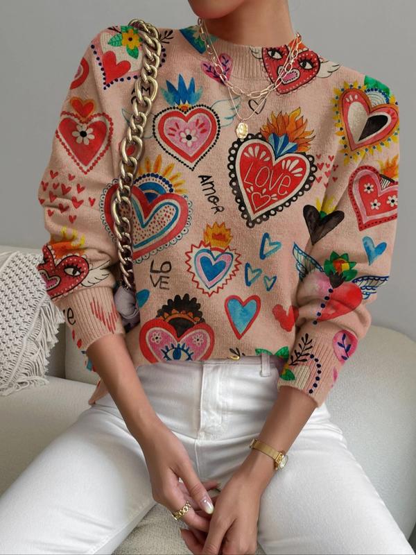 Women's Knitted Sweater, Cartoon Heart Print Design, Casual & Elegant Style, Perfect for Daily Wear, Holiday, Valentine Gift Idea