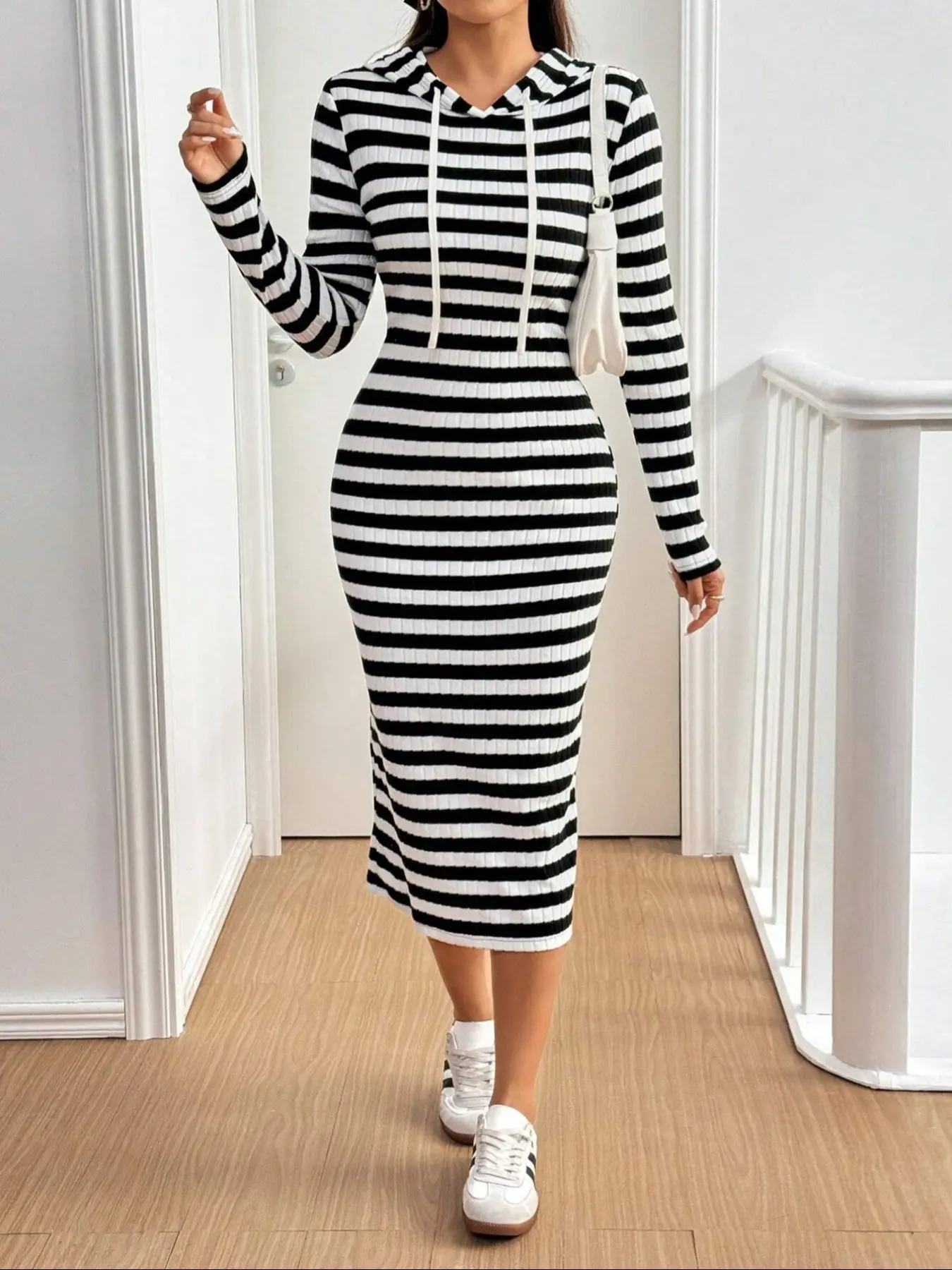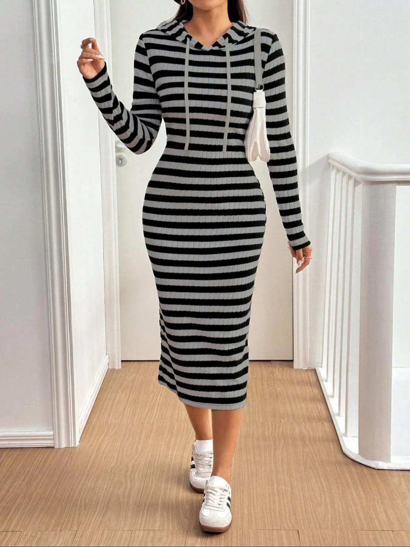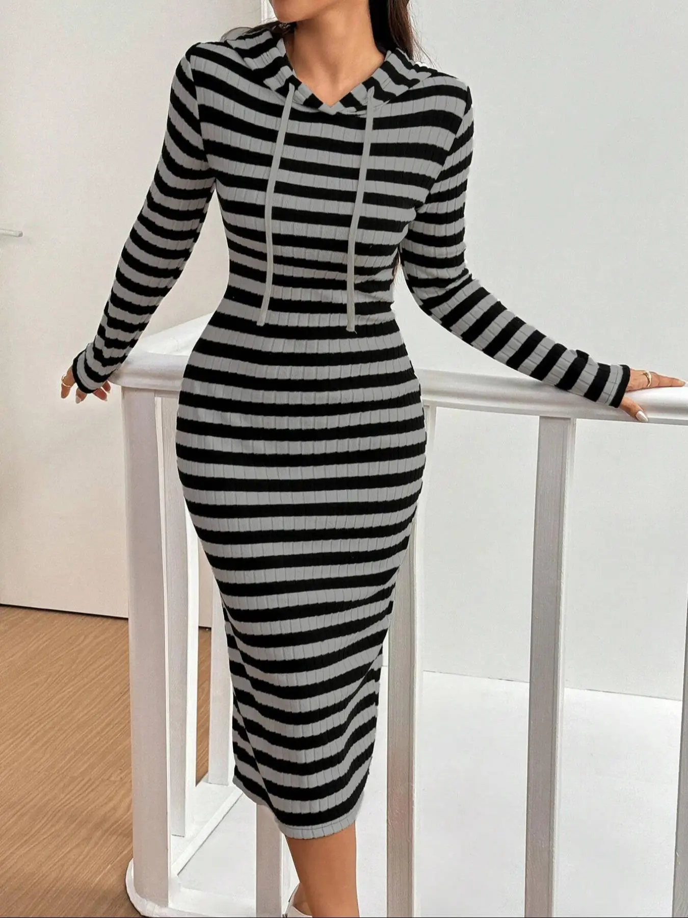 Rock this striped hooded dress, chic & cozy! 🖤 ✨#bodysuit #onepiecedress #hoodie #dress #womensdress