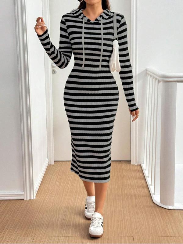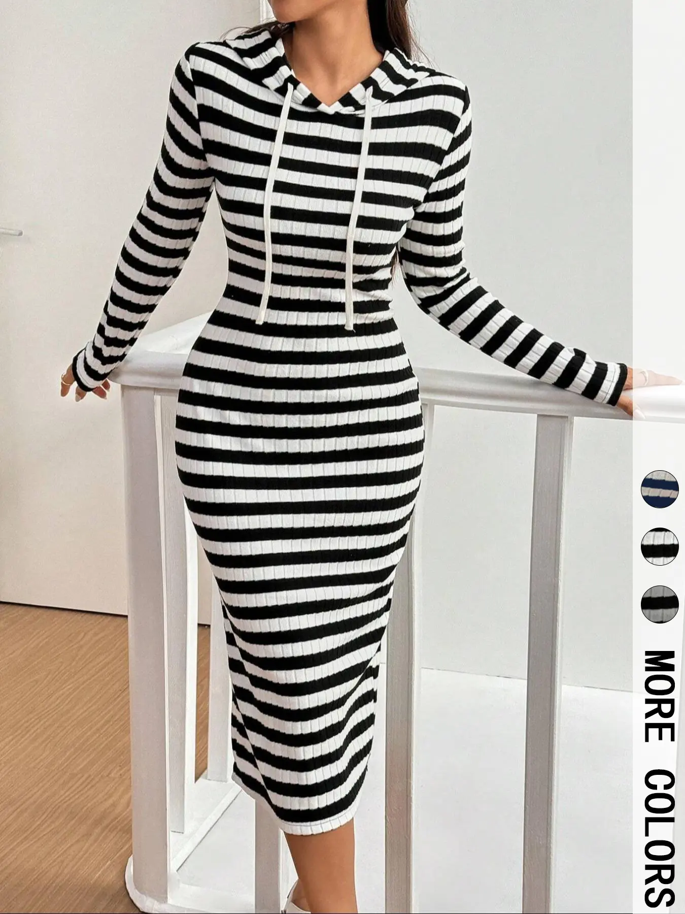 Striped hooded dress—ribbed fabric, bodycon fit, multi-color options! 🖤#hoodeddress #longsleevedress #stripeddress #dress #womensfashion