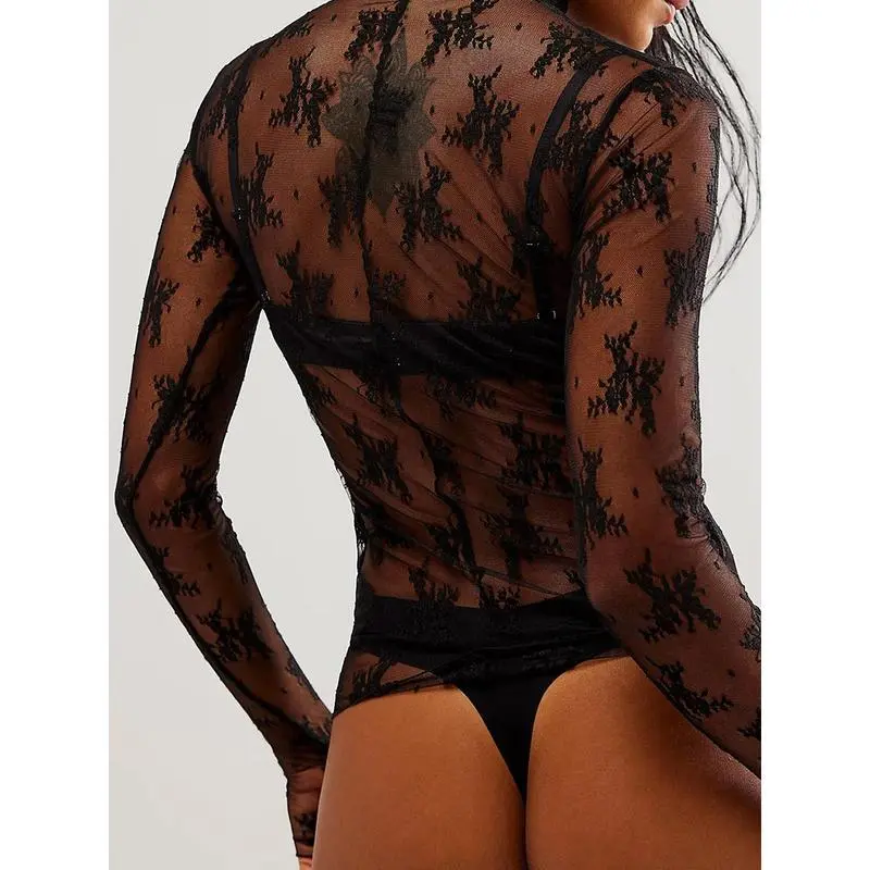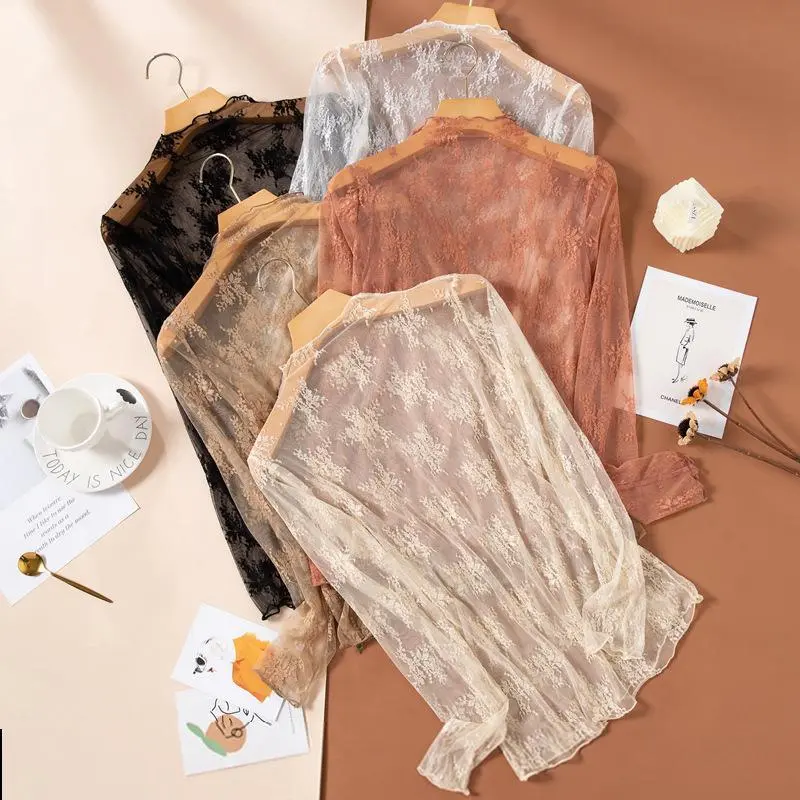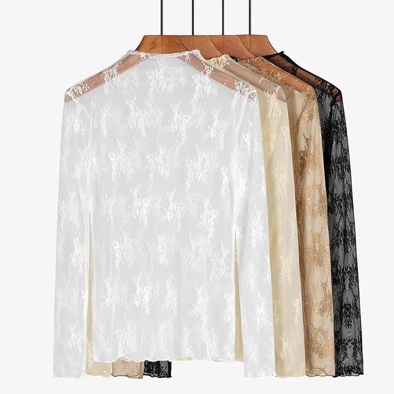 5. 3PCS Women's Lace Layering Top Long Sleeve Sheer Mesh Mock Neck Undershirt Lace Floral Tops See Through Shirt Blous,Multiple Chic Hues, Sheer Design, and Timeless Lace Detailing