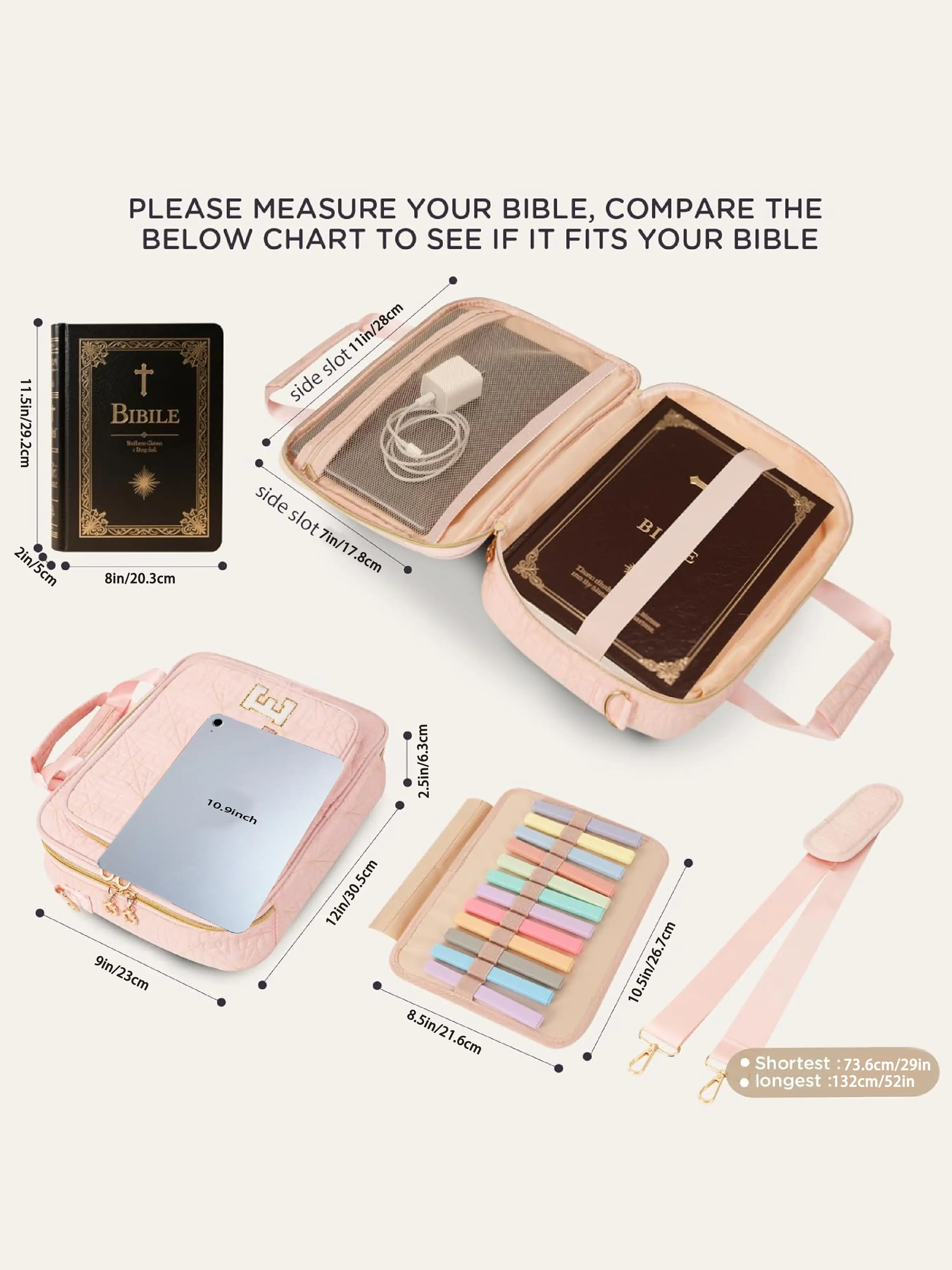 Generous Capacity: Designed to accommodate Bibles of various sizes, this women's Bible bag fits up to 12x9x2.5 inches. Please measure your Bible before purchasing.