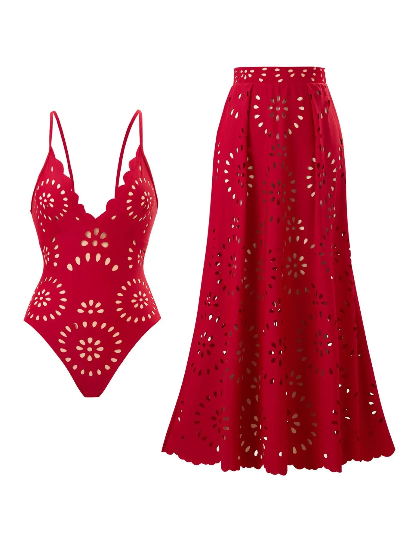 Women's Sexy Laser Cut Hollow Lace One-Piece Swimsuit Set, Slimming Beach Vacation Two-Piece Swimwear with Skirt, Casual Fitted Design