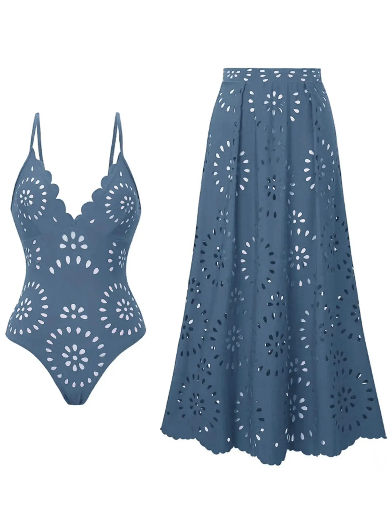 5. Women's Sexy Laser Cut Hollow Lace One-Piece Swimsuit Set, Slimming Beach Vacation Two-Piece Swimwear with Skirt, Casual Fitted Design