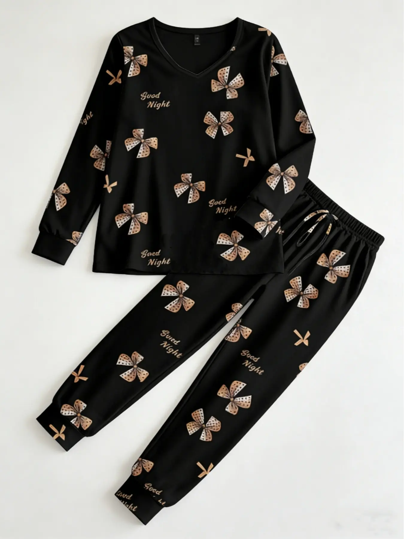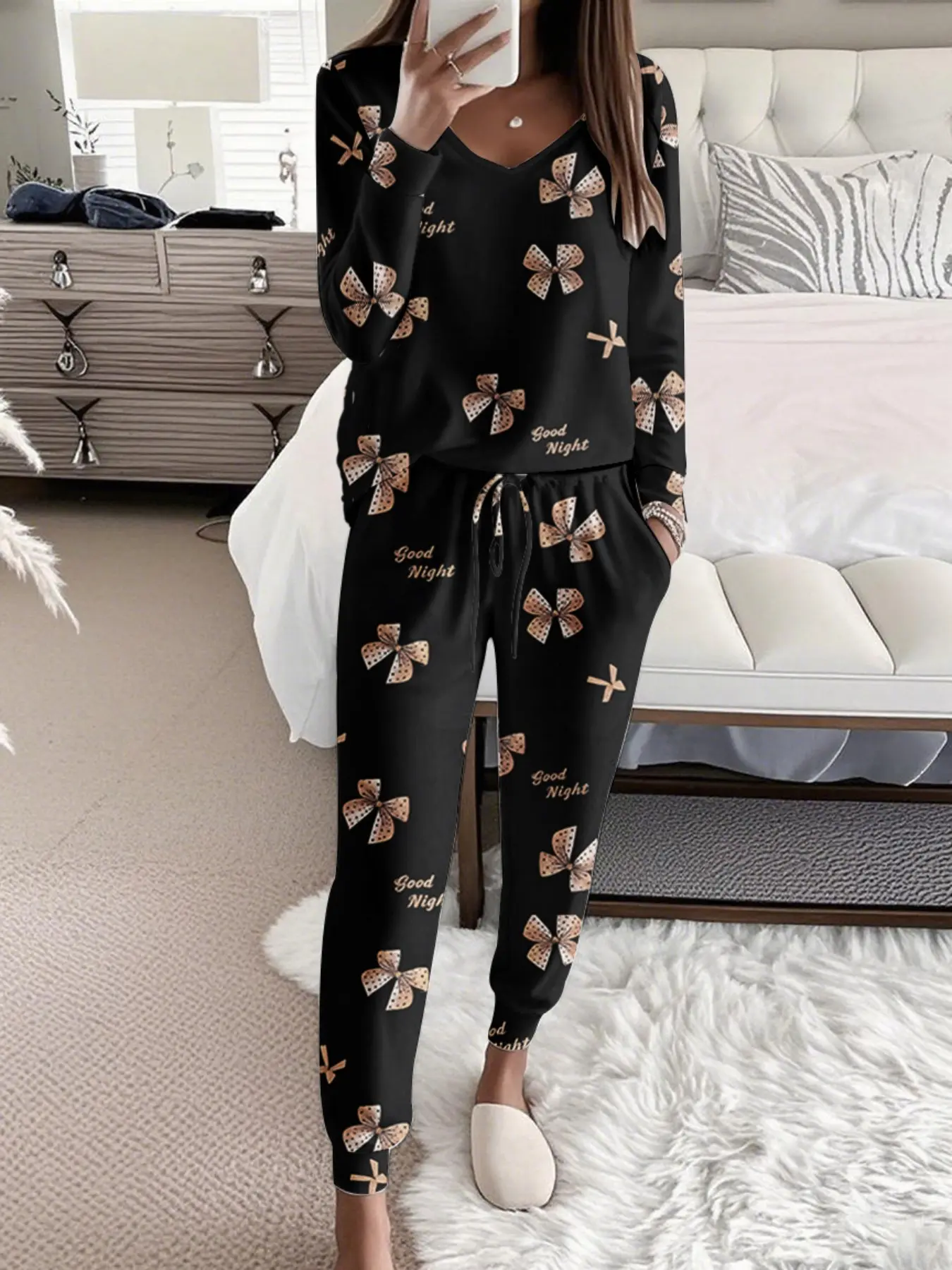 Women's Leopard Print Bow Letter Print Casual Set, Long Sleeve V Neck Top & Tie Waist Pants, Ladies Homewear Sleepwear