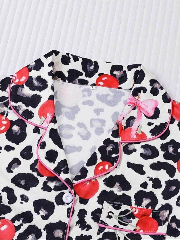 【Pink cherry】Women's Leopard Print Cherry Bow Sleepwear Set, Short Sleeve Button Front Top & Elastic Shorts, Casual Home Wear, Party