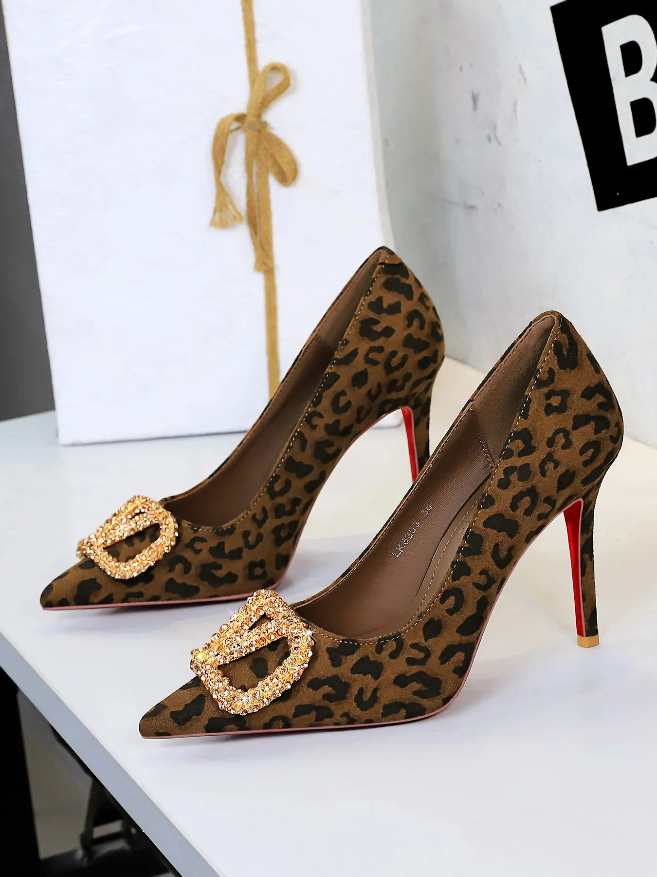 Women's Leopard Print High Heels, Rhinestone Buckle Design, Slip-On Comfortable Shoes for Women, Elegant Heeled Shoes, Stylish & Elegant FootwearWomen's Leopard Print High Heels, Rhinestone Buckle Design, Slip-On Comfortable Shoes for Women, Elegant Heeled Shoes, Stylish & Elegant Footwear