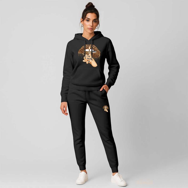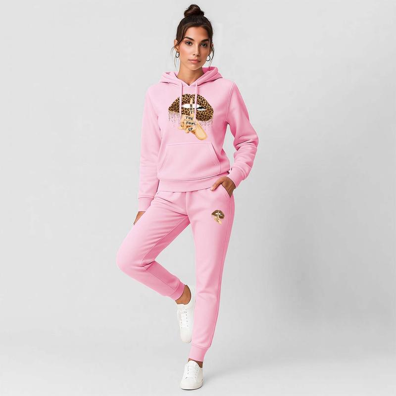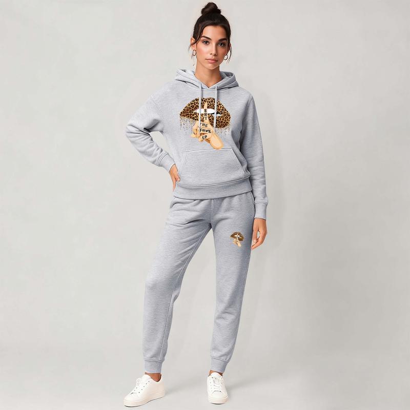 5. Women's Leopard Print Sexy Lips Print Hoodie And Drawstring Track Pants Set, Casual Sportswear, Long-Sleeved Hooded Jacket And Pants, Suitable For Autumn And Winter, Everyday Wear, Indoor And Outdoor Sportswear, Casual Sportswear.