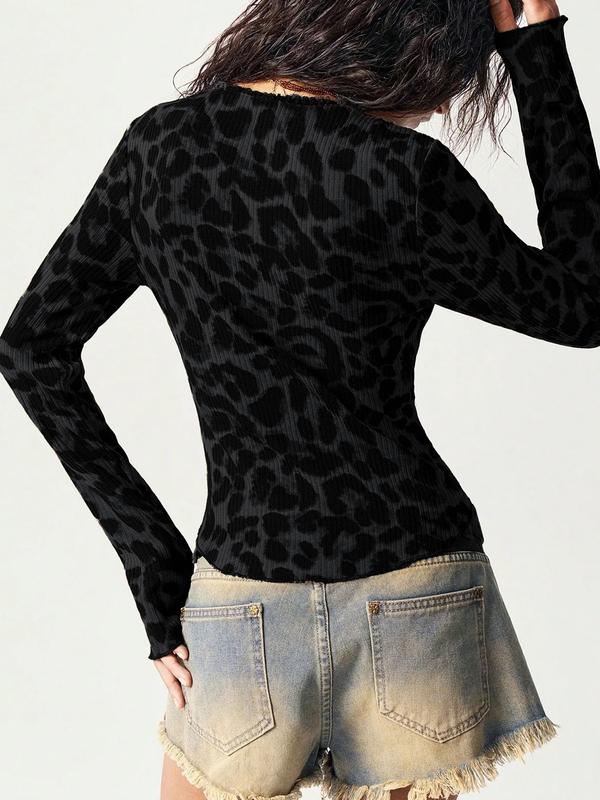 Women's Leopard Print Long Sleeve T-Shirt, Slim-Fit Casual Top for Fall Season, Stylish Fashionable Women's Clothing