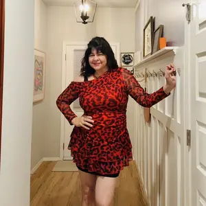 Sexy yet comfortable dress. The ruffle/flounce hem is very feminine. I’m usually a small/xtra small (129) but I sized up to a medium after seeing a model with no curves in a small. I received so many compliments from men and women.