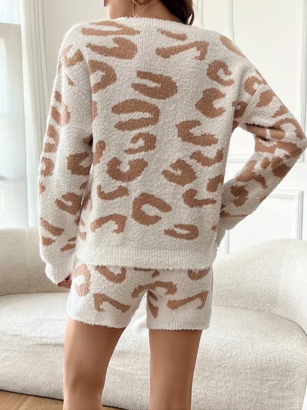 【COZY Soft Plush Feel】Women's Leopard Print Long Sleeve Top & Shorts Two-piece Set, Casual Fashion Cozy Round Neck Top & Shorts for Daily Wear, Ladies Sleepwear for Fall & Winter, Pajama