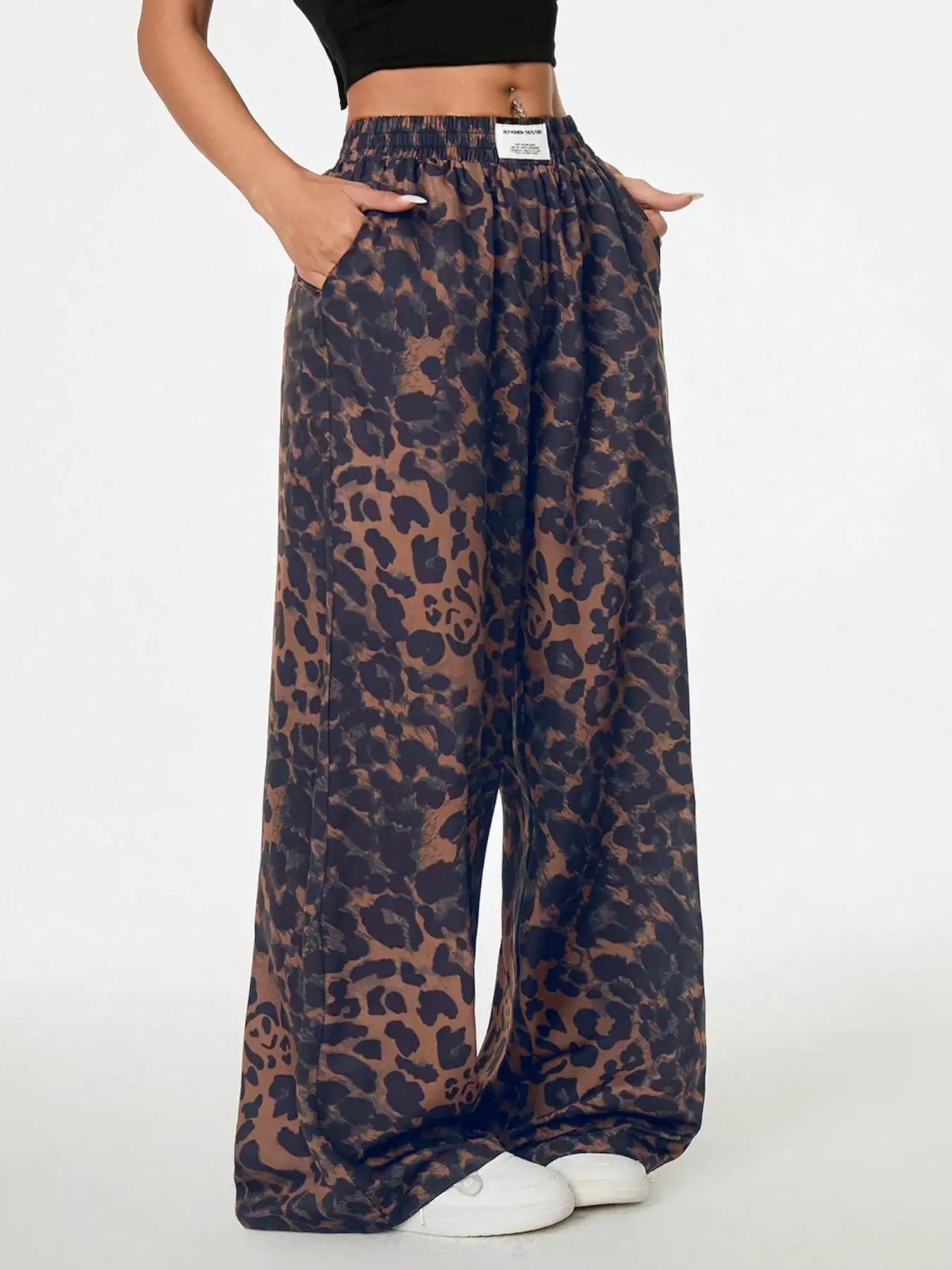 5. Women's Leopard Print Wide Leg Pants, High Waist Elastic Waist Loose Fit Street Style Long Pants, Fashionable Casual Wear, Casual Street Trousers