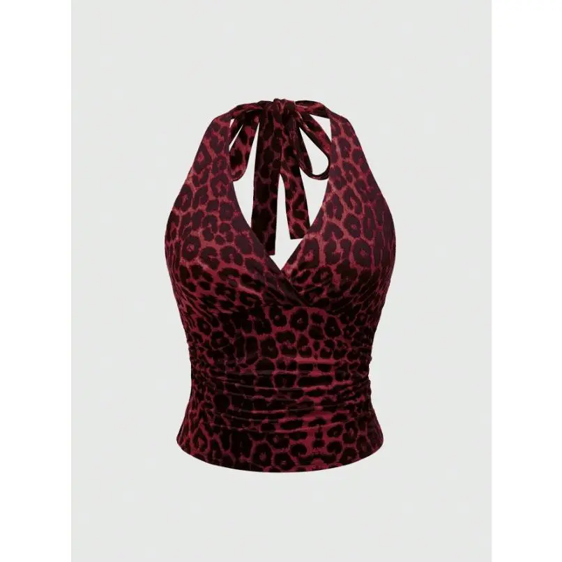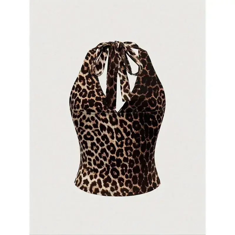 Women's Solid Color/leopard Print Halter Backless Top, Slim Casual Fitted Boho Chic Sleeveless Tie Top for Spring & Fall, Ladies Clothes for Daily Wear, Going Out Tops, Womenswear, Crop Tops, Casual Sleeveless Tank Top, Halter Tank Tops(Sheet)