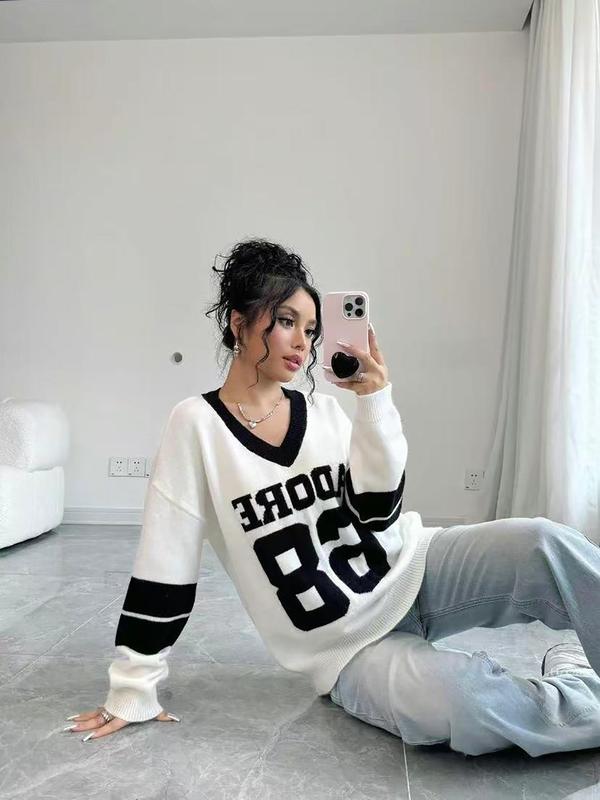 5. Autumn Winter Color Block V Neck Sweater for Women, Casual Loose Knitwear with Letter Design, Trendy Streetwear, Comfortable Long Sleeve Sweatshirt