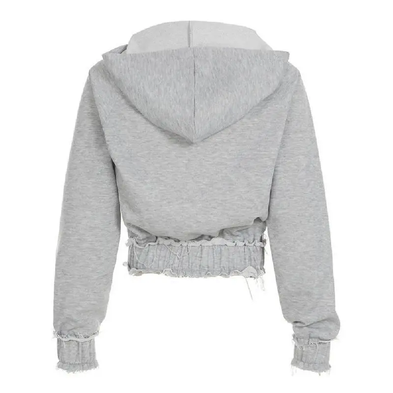 [Distinct Lettering]: Features a unique letter print that adds a modern and expressive touch to your outerwear collection./[Raw Hem Detail]: The raw hem provides an unfinished look that enhances the jacket's urban aesthetic, standing out from the norm./[Convenient Pockets]: Equipped with practical pockets to securely store essentials, offering functionality without sacrificing appearance./[Hooded Neckline]: The hooded neckline adds a practical element, providing extra warmth and protection against the elements./[Medium Stretch Fabric]: Crafted from French terry with medium stretch, ensuring a fitted feel that allows for ease of movement.