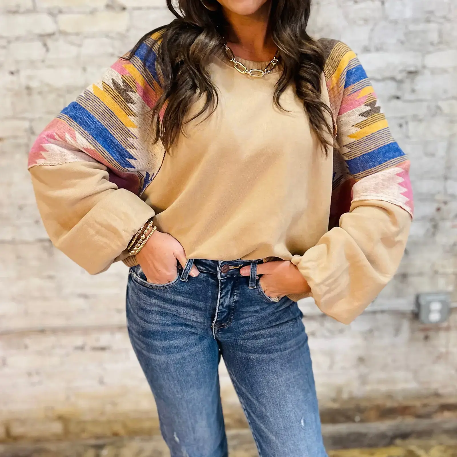 Women's Light Beige Aztec Patchwork Raglan Sleeve Pullover Sweatshirt