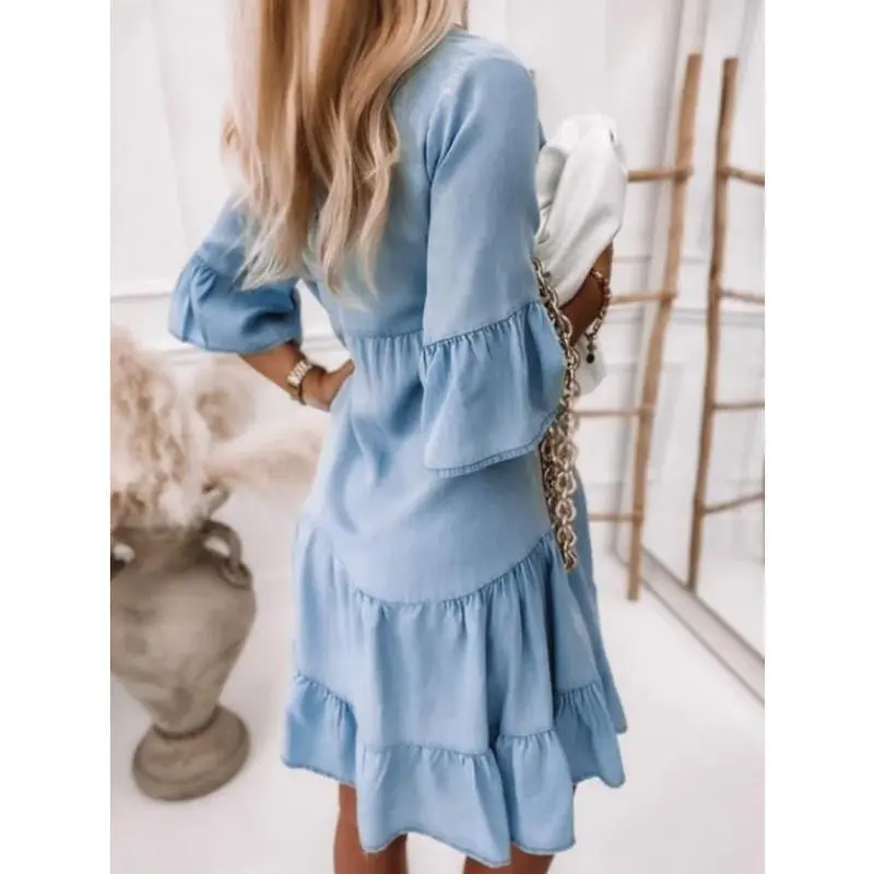 Solid Color Washed Cotton Five-Quarter Sleeve A-Mid-Length Denim Dress, Women's Denim Effect Printed Ruffle V-Neck Dress, Summer Casual Short Sleeve Dress, Fashion Women's Daily Wear Womenswear Comfort Basic Light Blue Minimalist