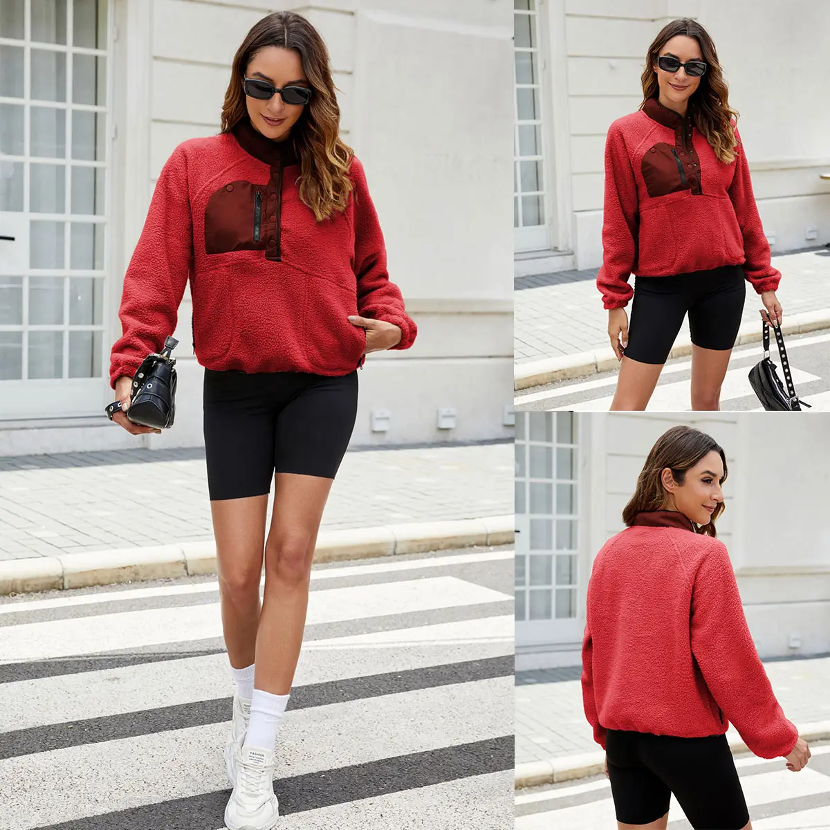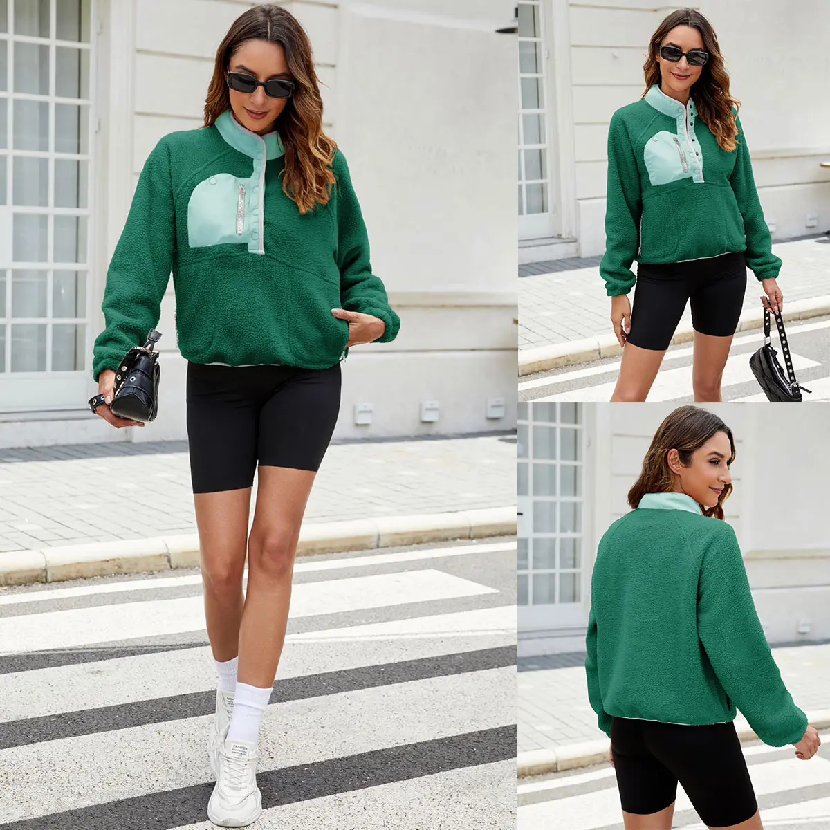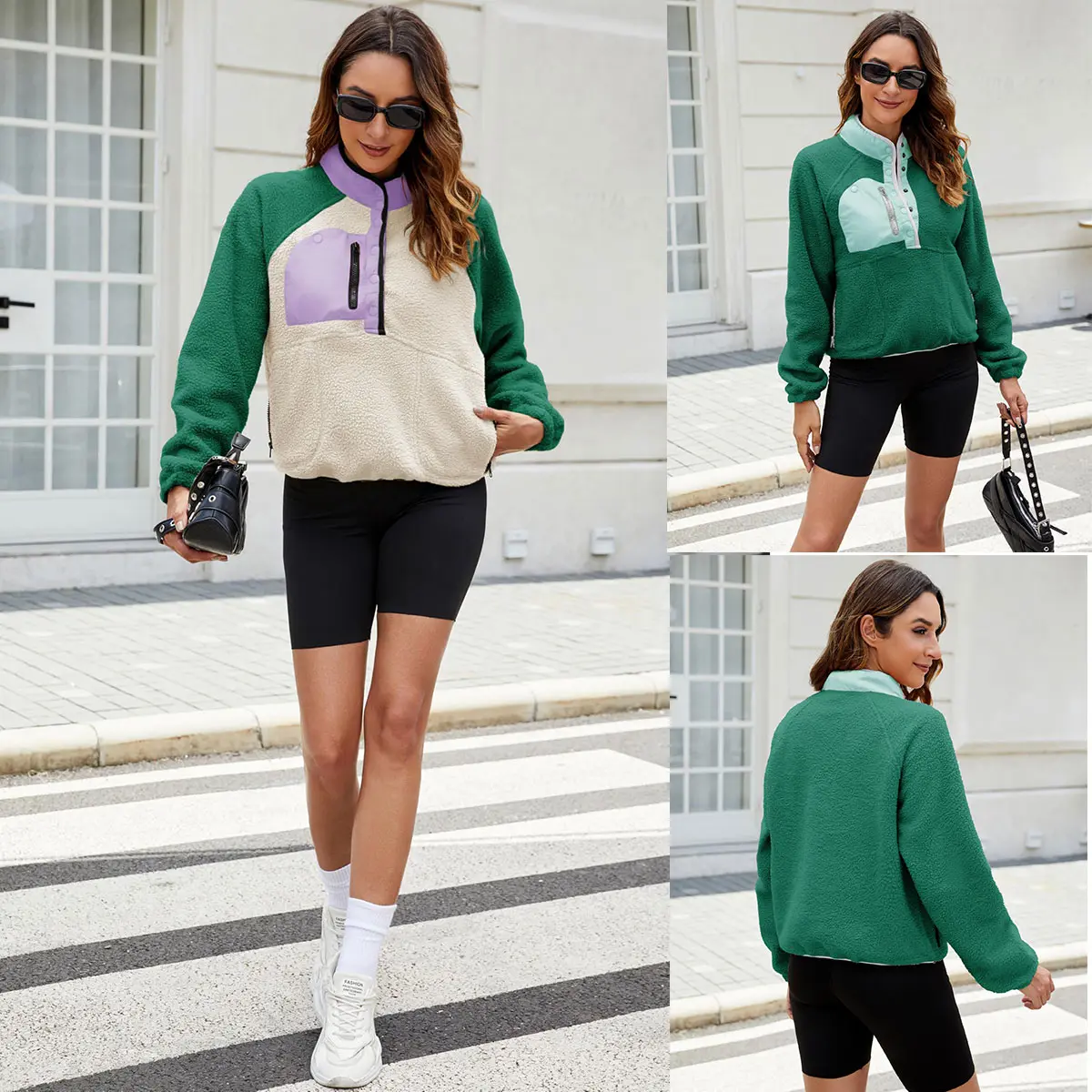 Casual trendy fuzzy fleece pullover Jacket for women, features with fashion color block design, half snap button, standing collar or lapel, raglan long sleeve, two side zipper pockets, cropped length, loose fit, a stylish fuzzy hoodie jacket outerwear in fall winter chilly day