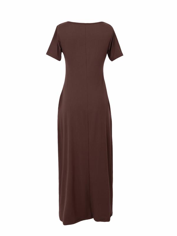 Women's Long Coffee Color Dress, Casual Fitted Style, Large Round Neck Short Sleeve Pocket Sleepwear, Soft Fabric All Seasons Wear