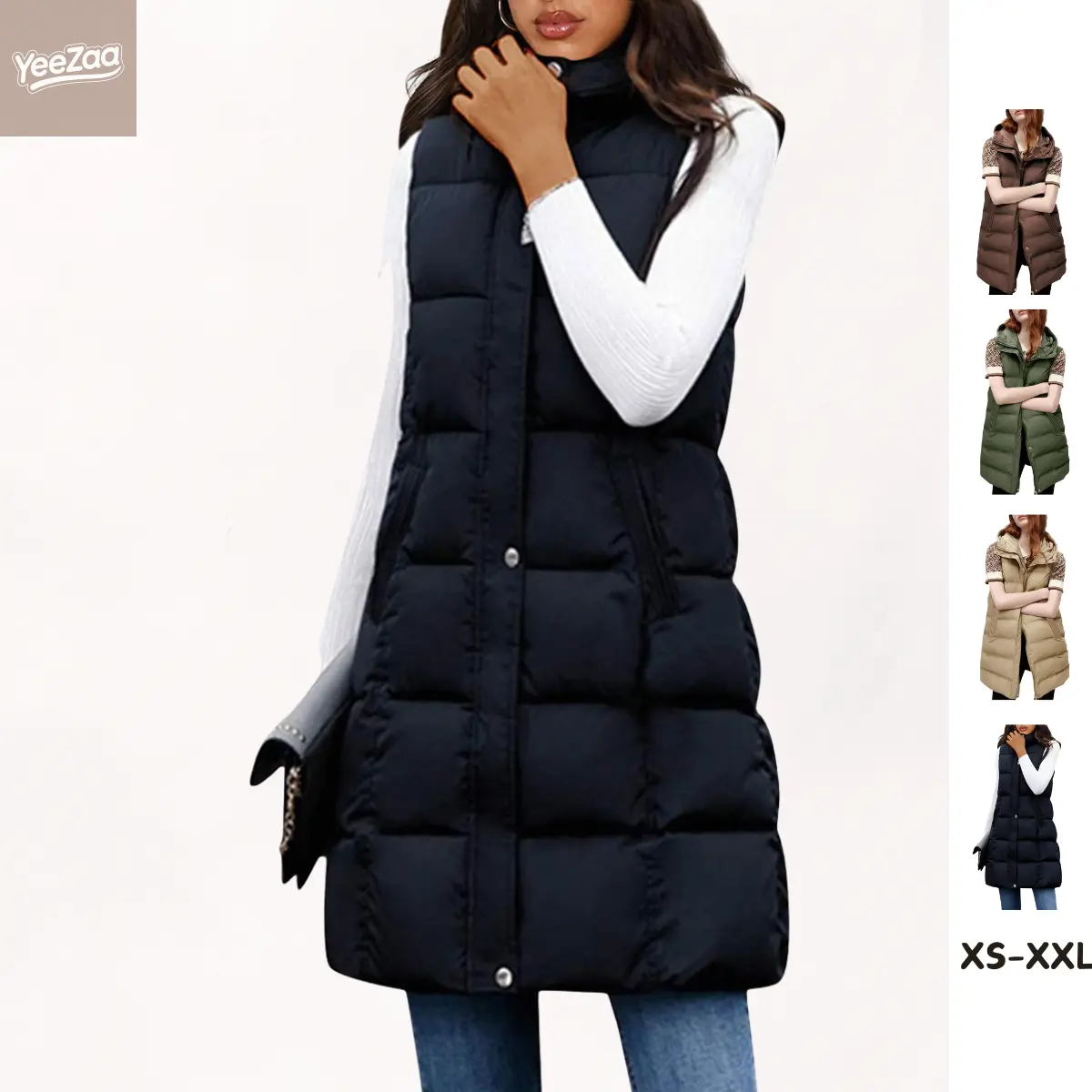 • The vest is filled with soft down-alternative and cotton padding, ensuring comfort. It's a must-have basic item for your wardrobe. Available in various colors: black, brown, white, red, green, tan, and more. Add this versatile long down vest to your wardrobe for a fashionable layering piece.