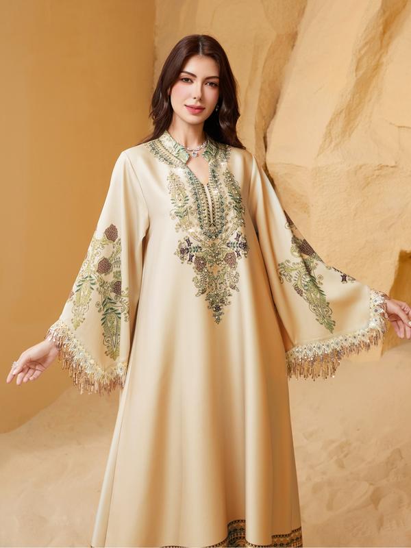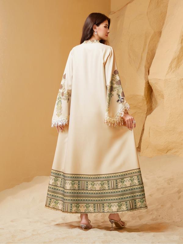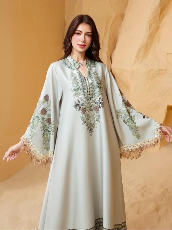 Women's Elegant Long Dress, Loose Fit Ethnic Print, Lace-Up Design, All-Season Wear, Perfect for Evening Occasions & Special Events
