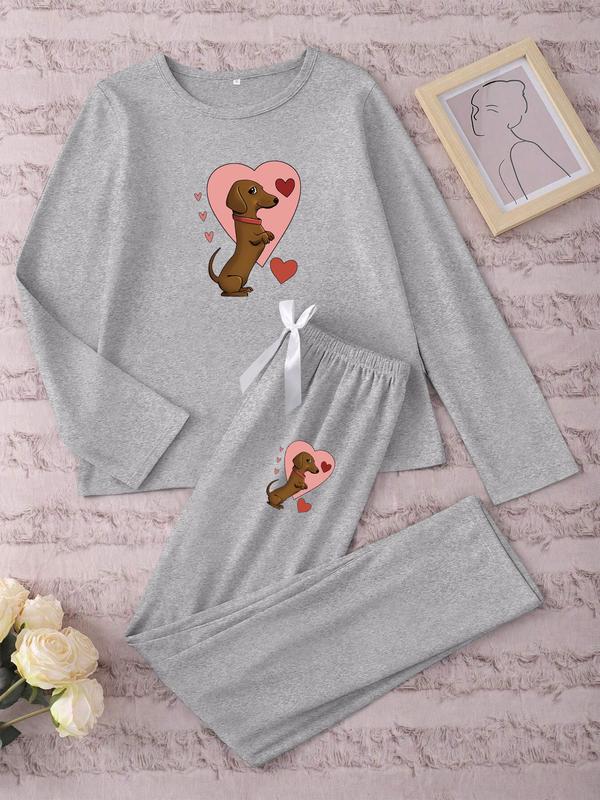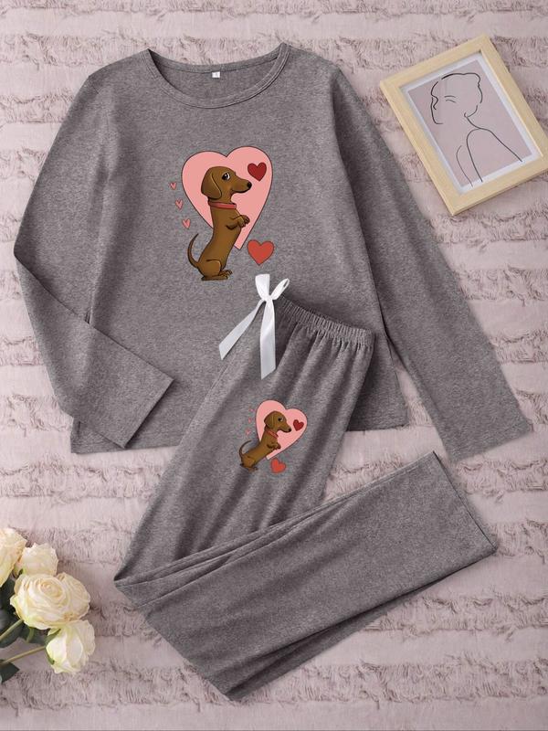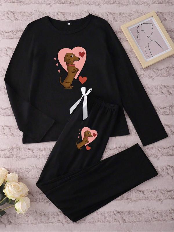 Women's Long Sleeve Pajama Set Cartoon Heart Sausage Dog Print, Casual Fitted Sleepwear Loungewear for Spring & Fall, Comfortable Kint Fabric