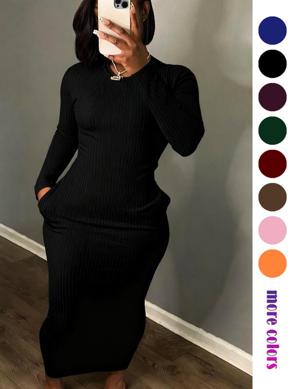 Women's Long Sleeve Dress with Pocket, Breathable Stretchy Solid Color Maxi Dress for Party, Casual and Travel, Stylish All-Day Wear