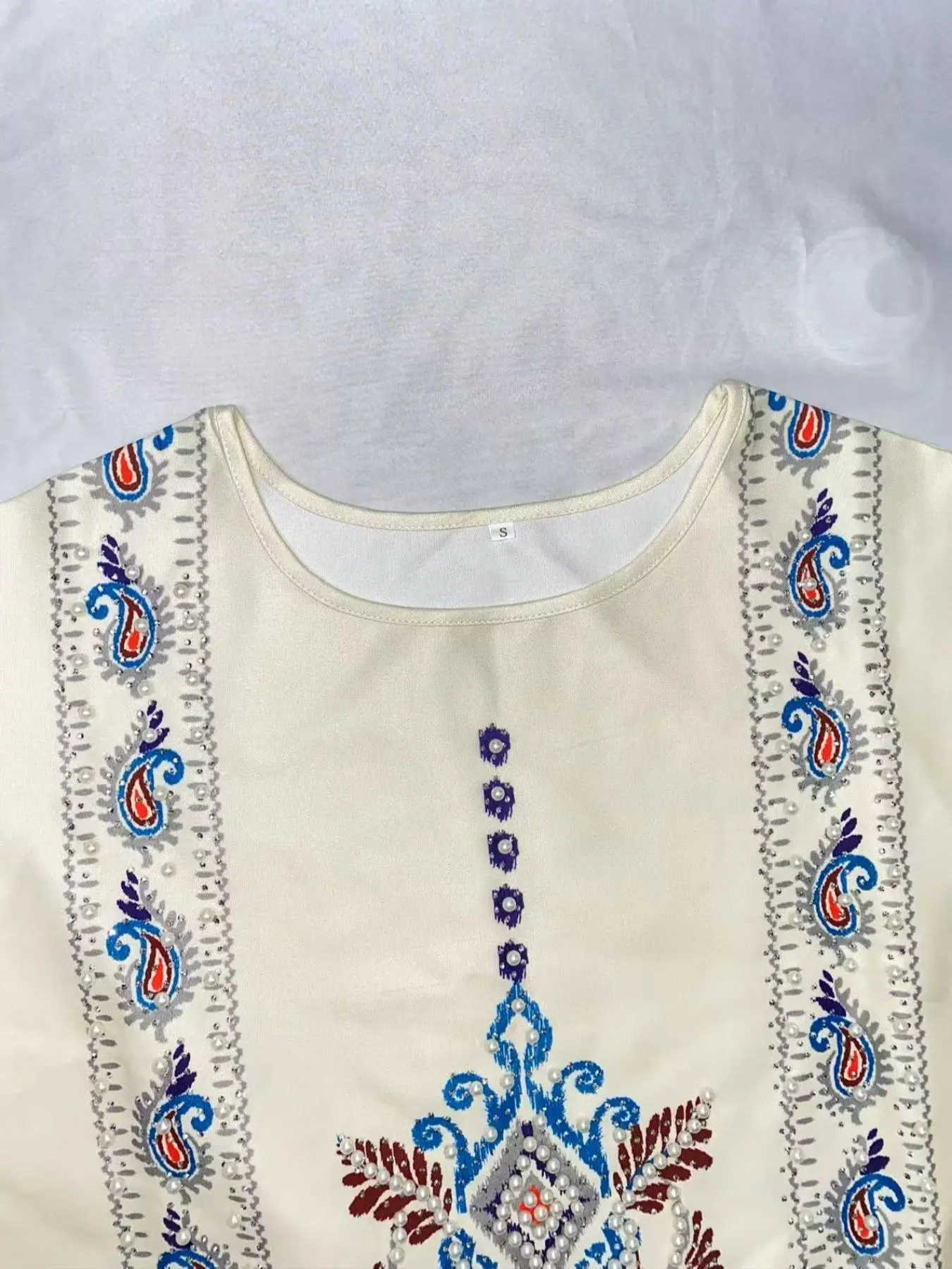 5. Middle Eastern Women's Embellished Pearl Round Neck Floral Printed Luxurious Elegant Jalabiya Dress, Loose-Fitting All Seasons Fashion