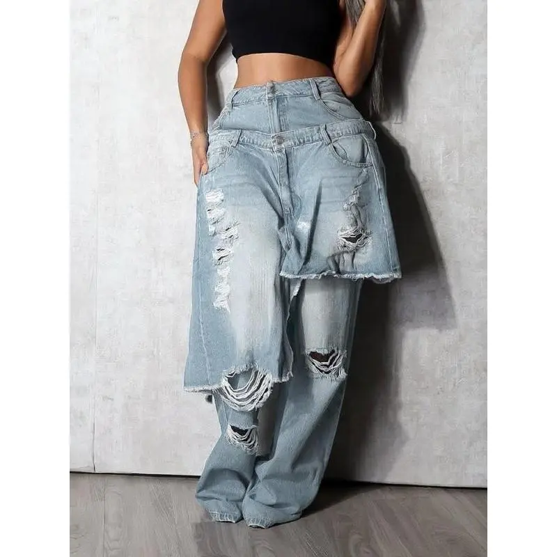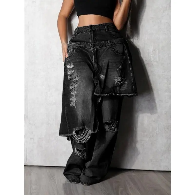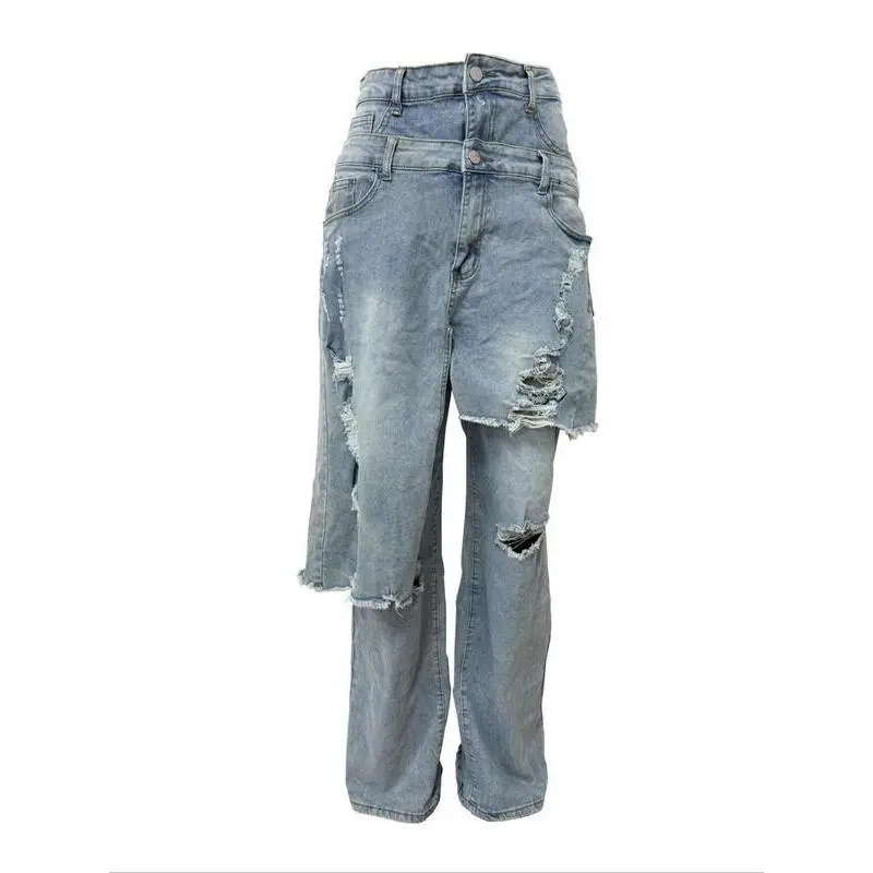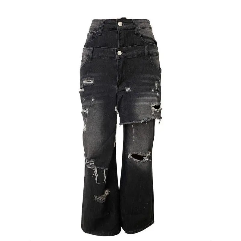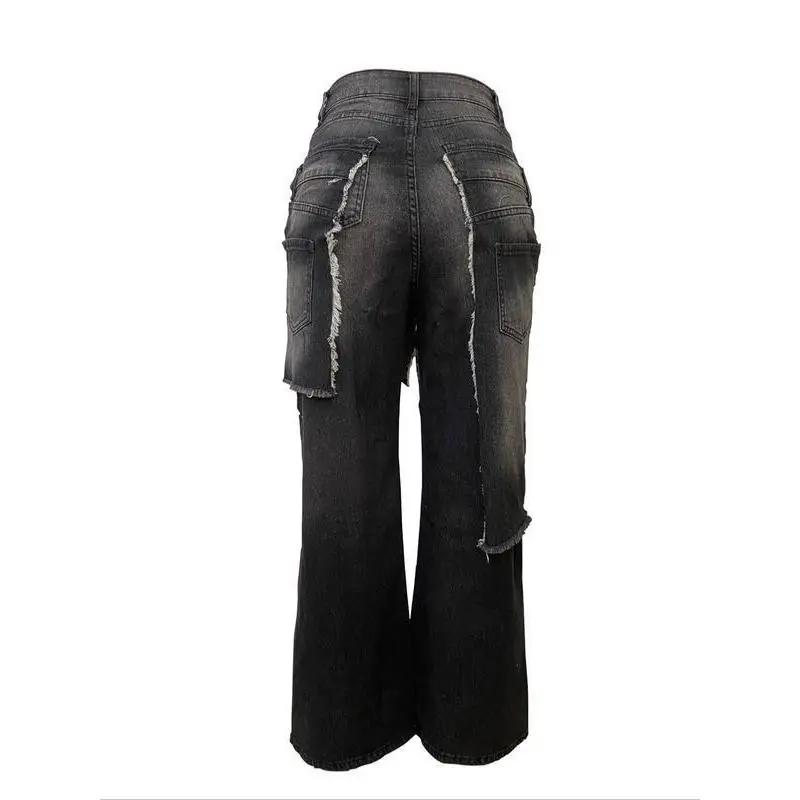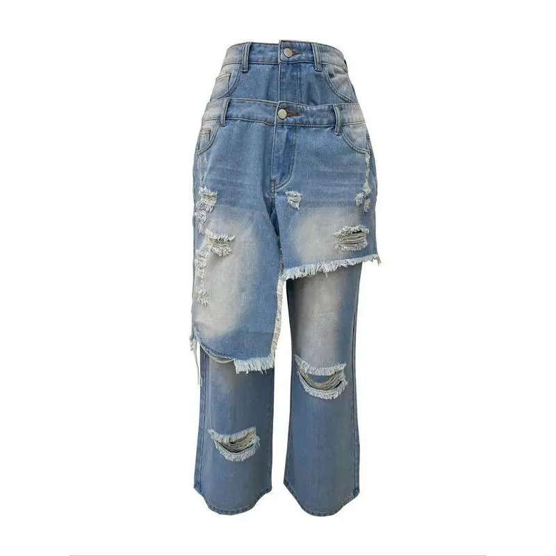 Women's Loose Fit High Street Patchwork Casual Pants, New Fashion Style, Hip-Hop Ripped Design, Long TrousersRagq