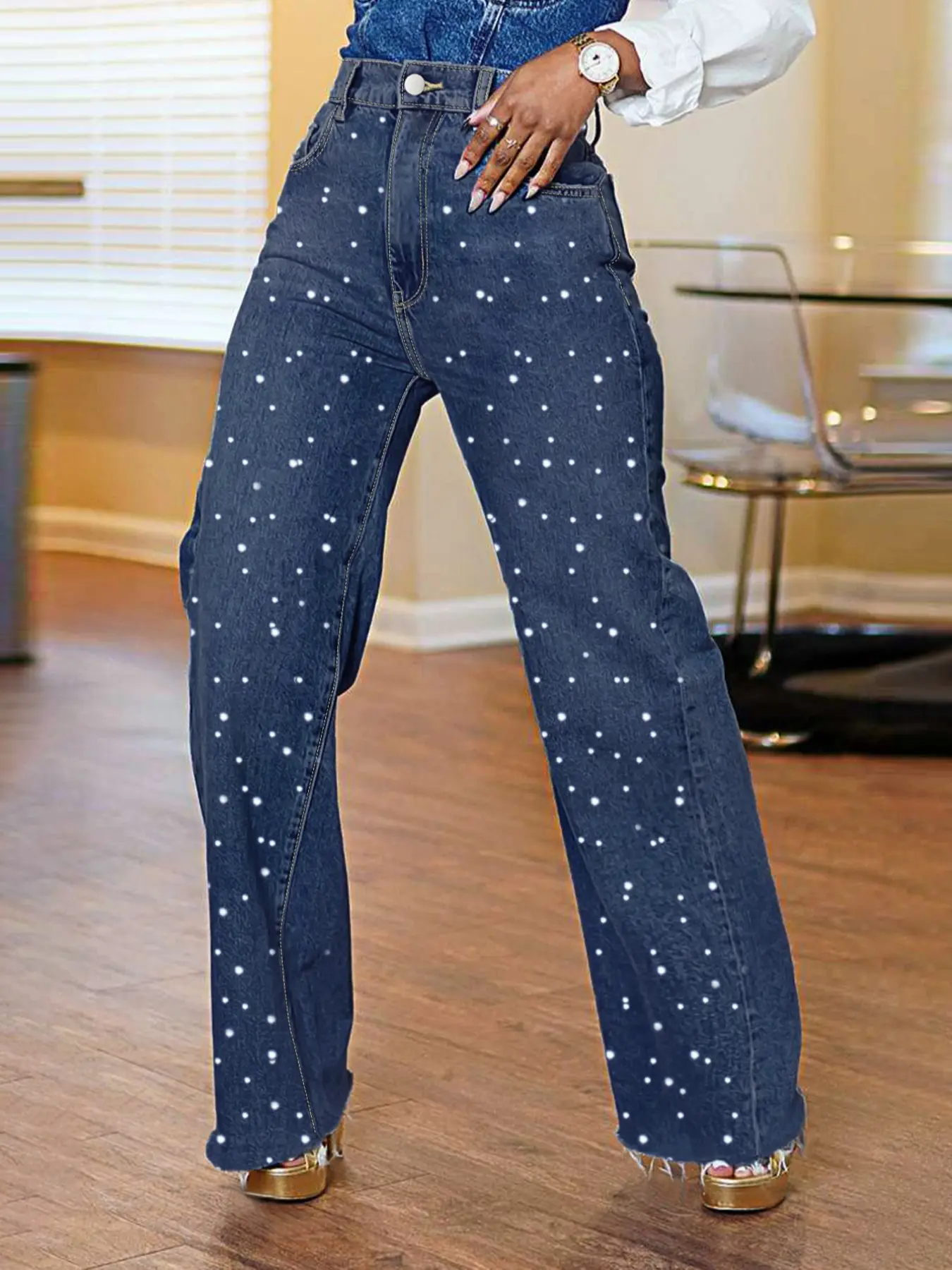 Jeans mezclilla elastizado con perlas#womens#loose#jeans#