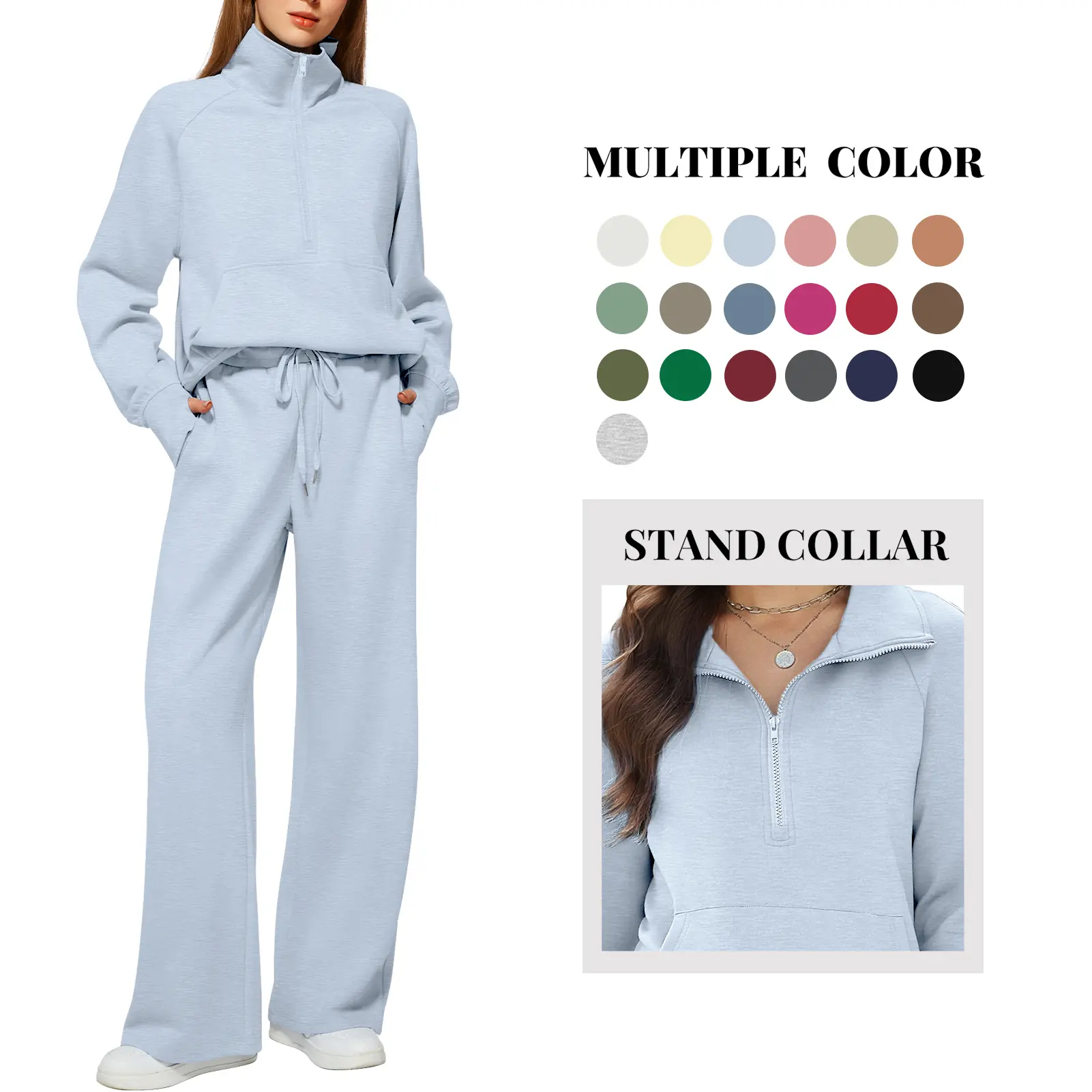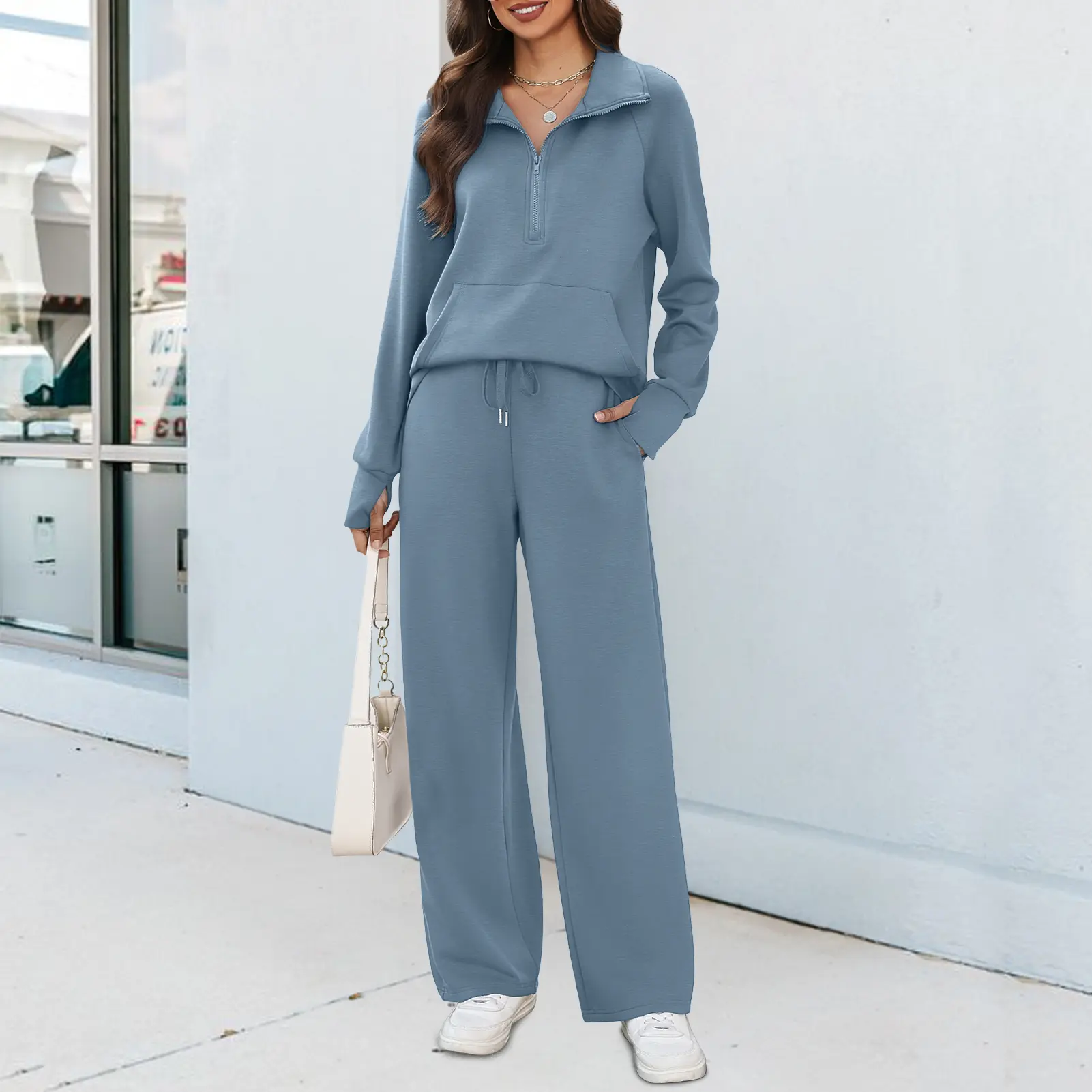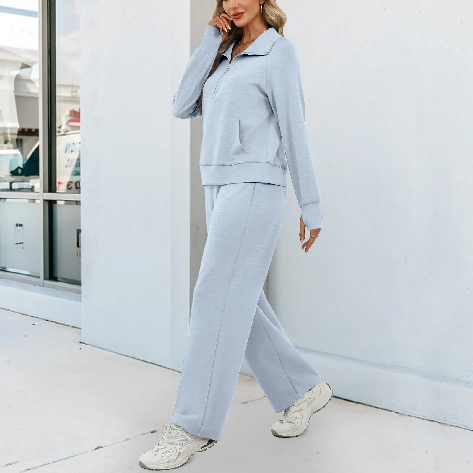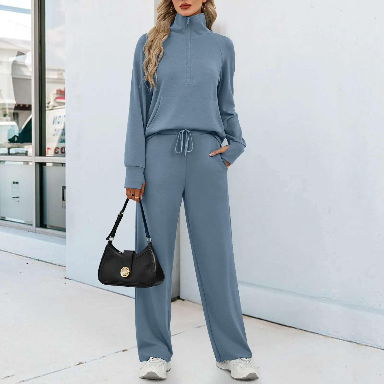 Trendy Design 🌟- Half-zip sweatshirt- High-waist wide-leg sweatpants- Ribbed cuffs- V-neck- Drop shoulder- Long sleeves with thumbholes- Spacious pockets- Effortlessly creates an oversized style and chic look
