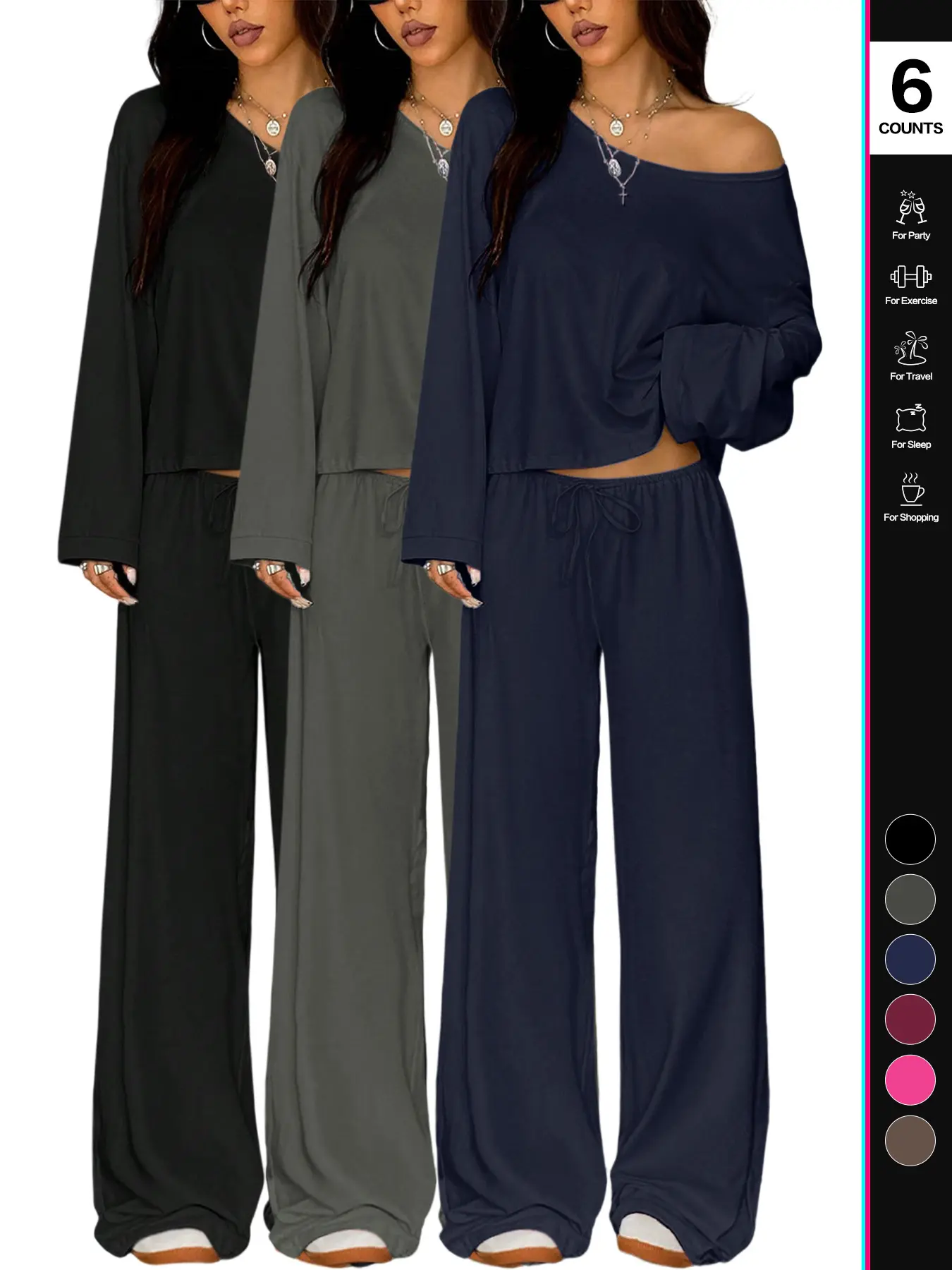 Women's 2 Piece Matching Lounge Set Off The Shoulder Long Sleeve Top and Drawstring Wide Leg Pants Casual Sweatsuit