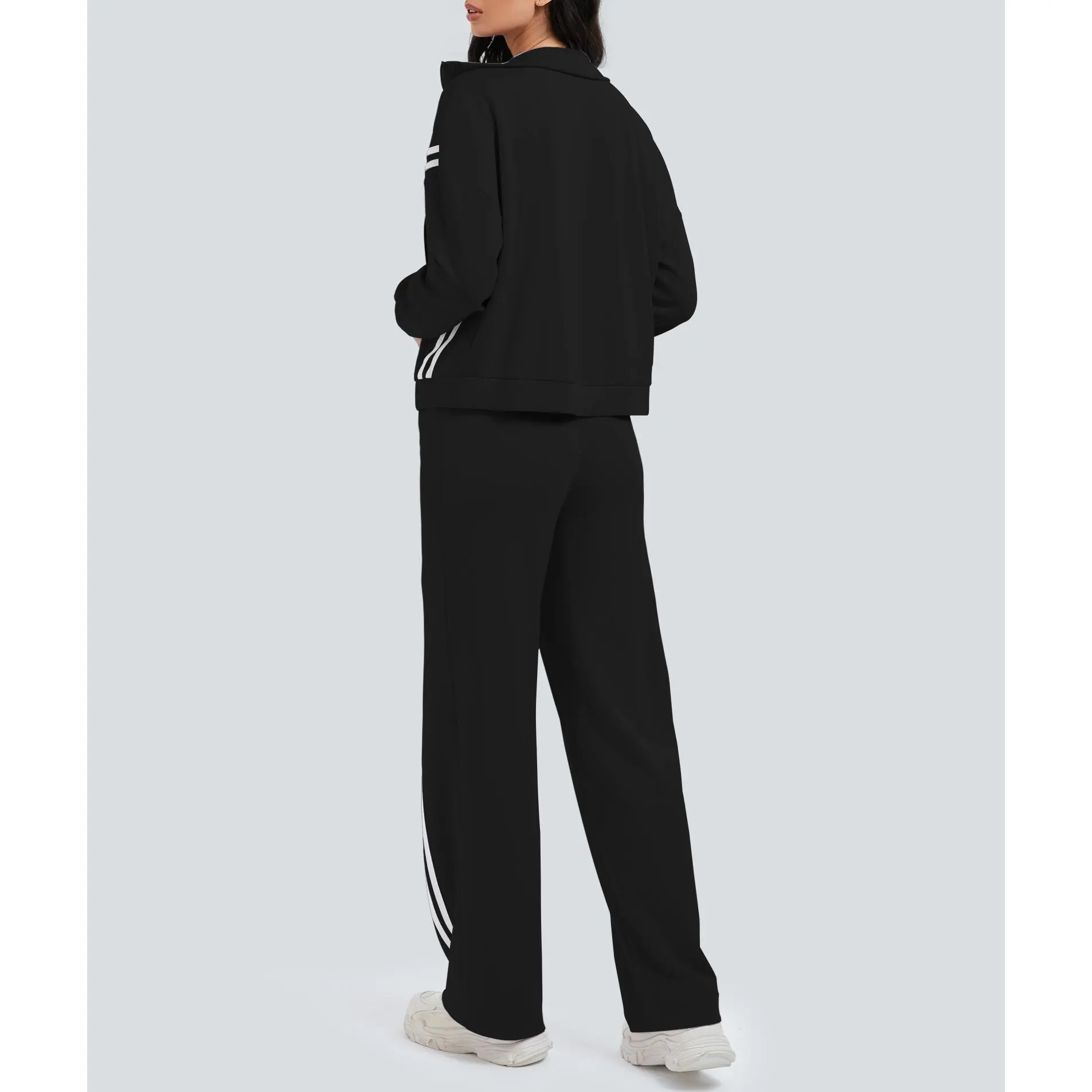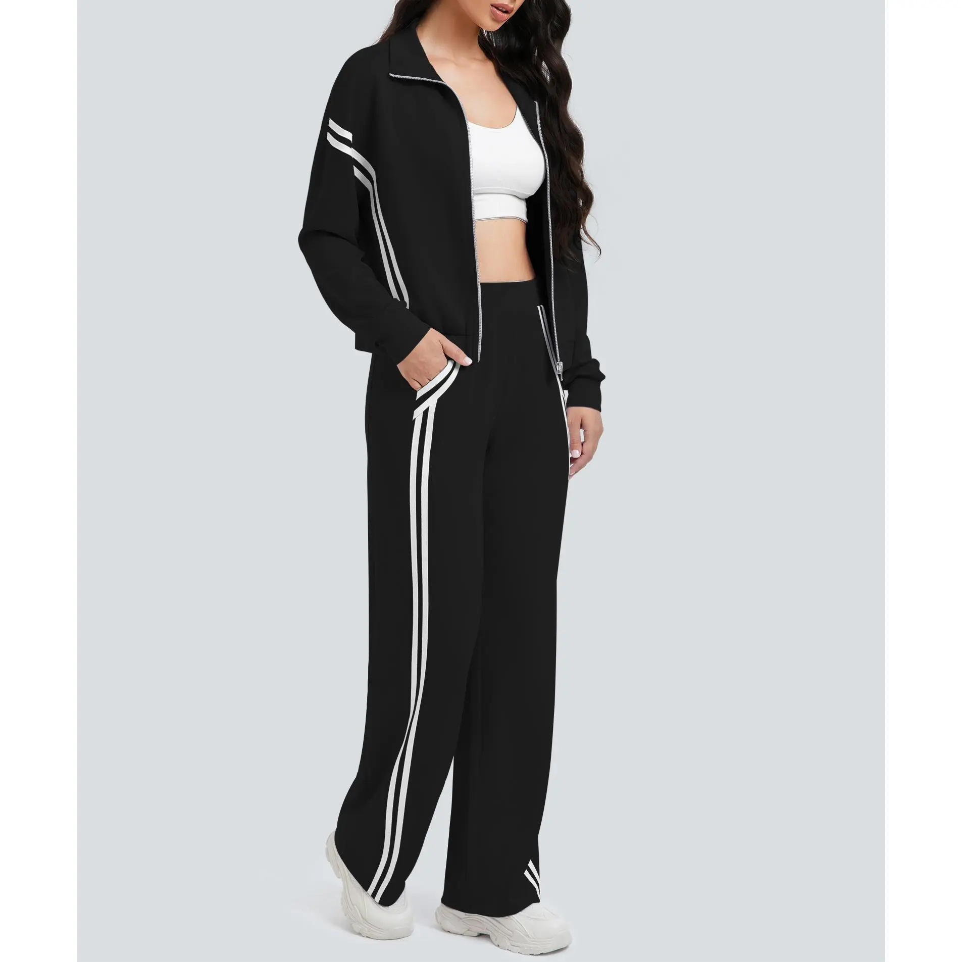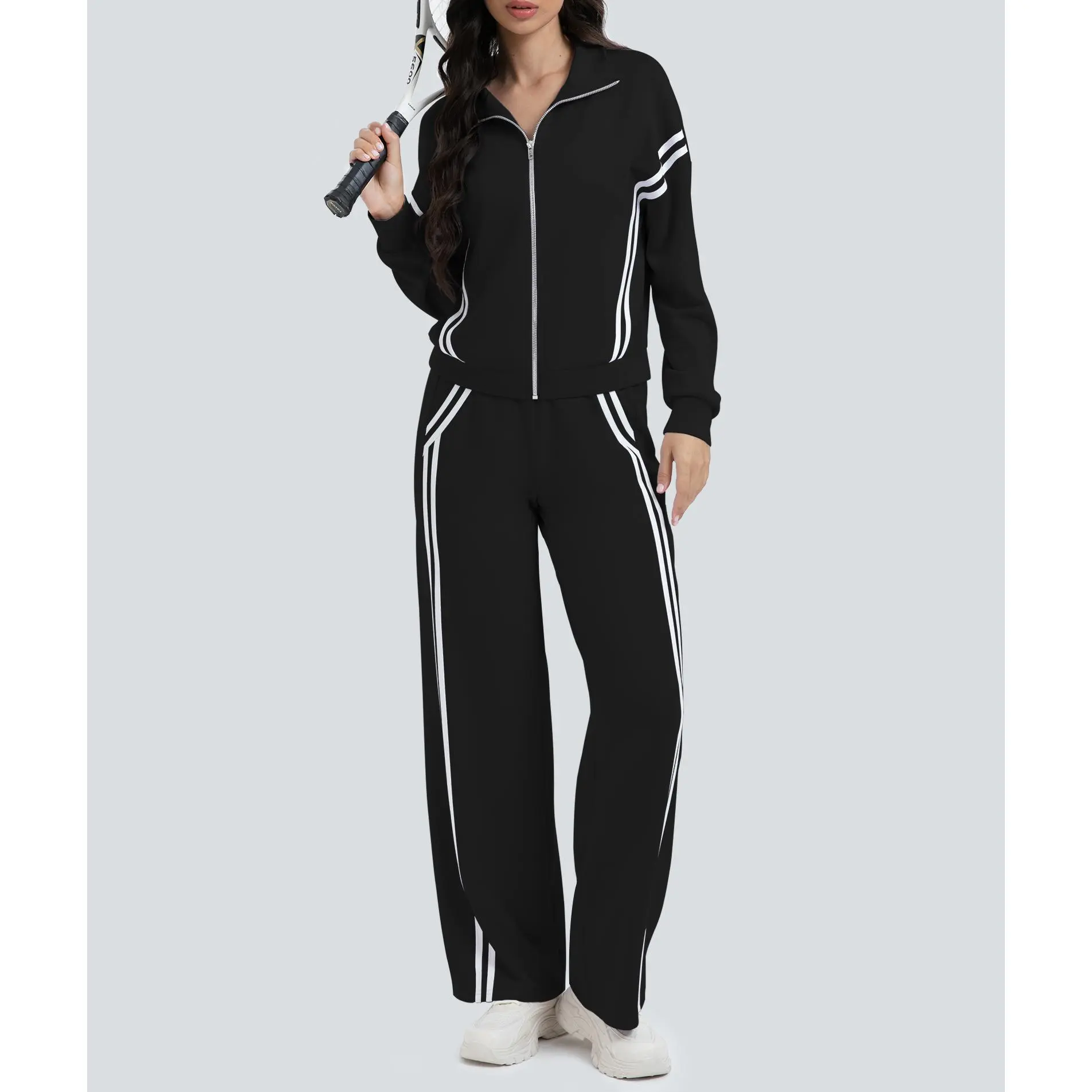 ·【Eye-Catching Design】Women's tracksuit features contrasting side stripes for an elongated effect. Zip-up, long sleeve, stand collar jacket, high waist, wide-leg pants, with pockets, loose fit to suit all body types. It is a suit that meets comfort, style and practicality.