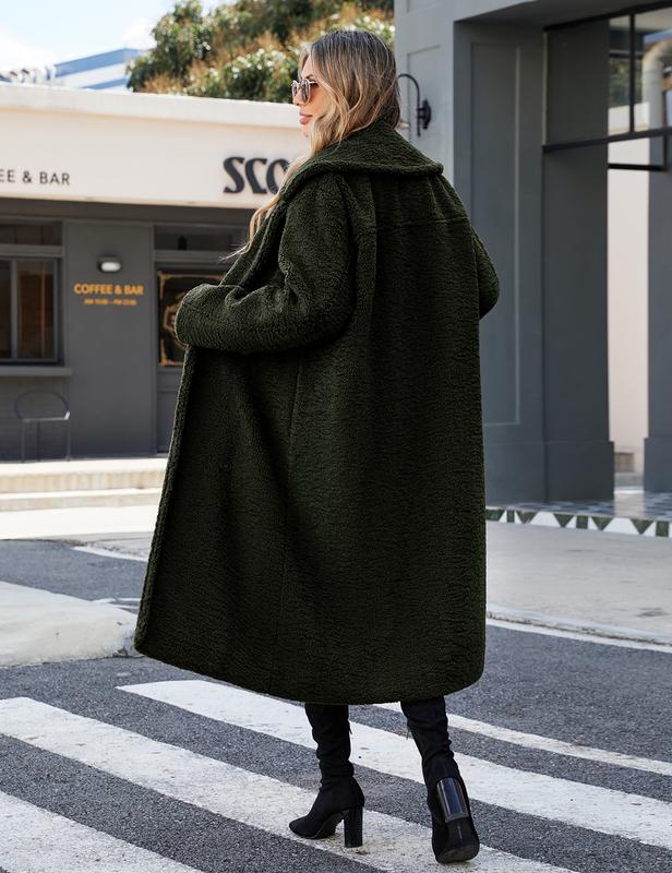 ·Designs: Women's coat designed with a mid-length, loose and structured silhouette that falls to the calf, this coat features a large notched lapel, long sleeves, and a double-breasted button closure. Trench coat for women are two slash pockets on both sides of the garment to keep your hands warm and can also be used to keep your phone and some small items. This sherpa coat has the right thickness without looking too bulky, perfectly suits for cool fall & winter