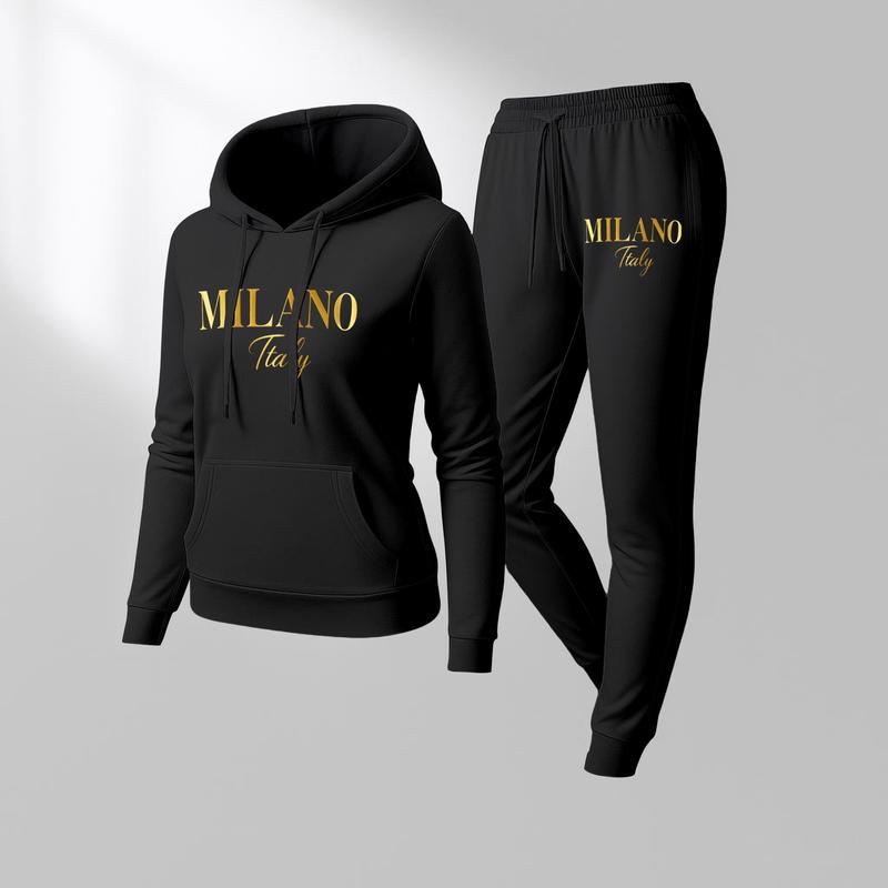 5. Women's MILANO Print Hoodie And Drawstring Track Pants Set, Casual Sportswear, Long-Sleeved Hooded Jacket And Pants, Suitable For Autumn And Winter, Everyday Wear, Indoor And Outdoor Sportswear, Sportswear Set, Casual Sportswear.