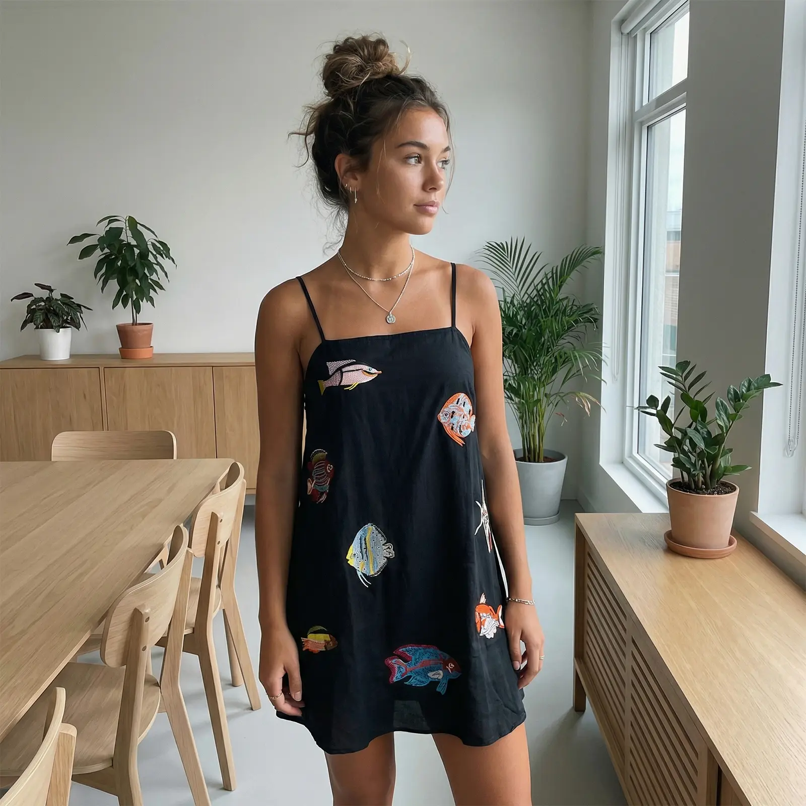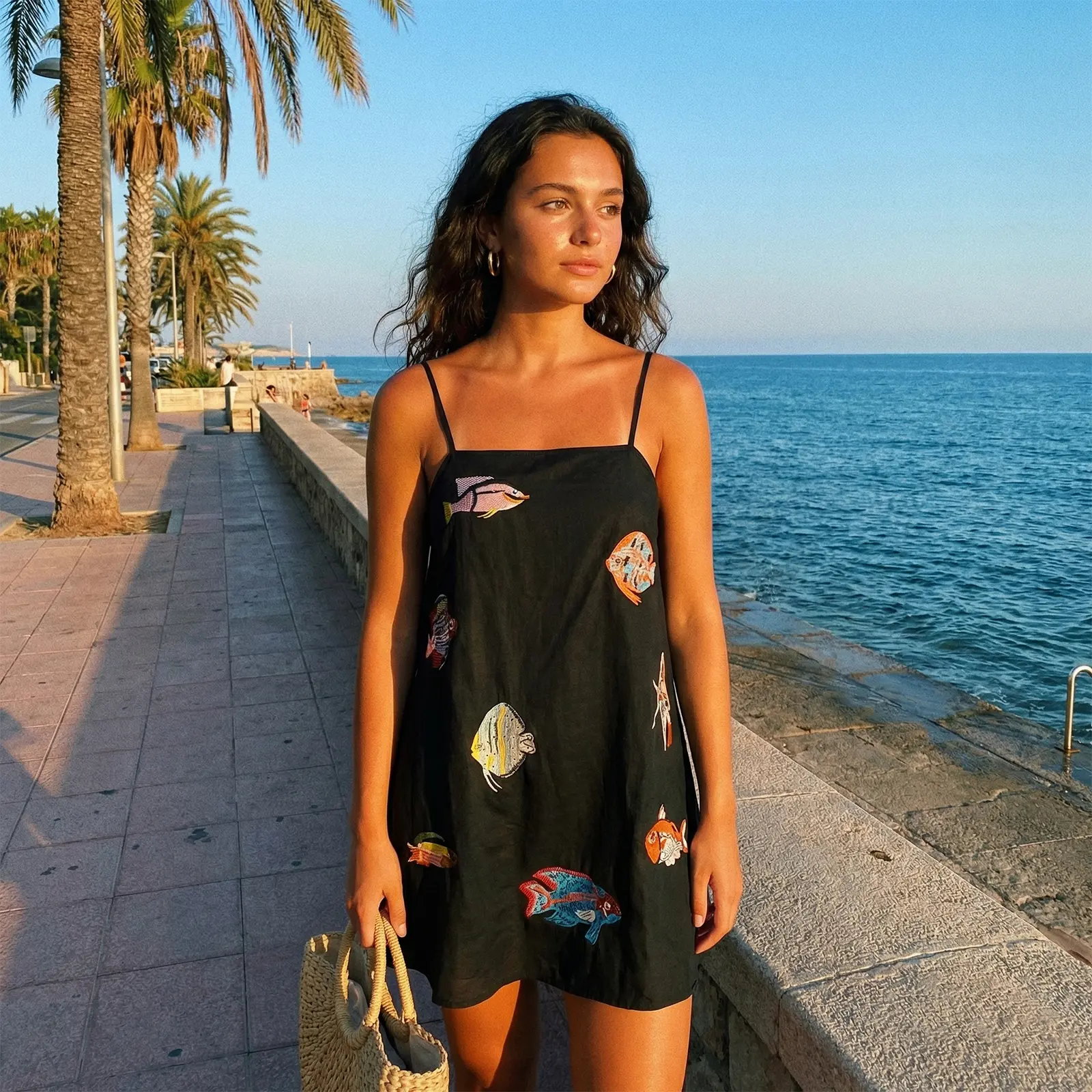 It’s so freakin cute A bit short cause I’m 5’10 but will still absolutely wear out esp on hot summer days. Love the embroidered fish and feels like nice fabric v obsessed live the low back