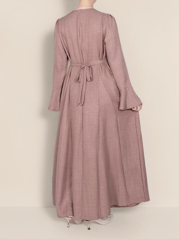 The hidden back zipper ensures an easy fit, while the self-tie waist belt lets you adjust the silhouette for a flattering shape. The flowy A-line skirt moves gracefully with every step, and the ruffled princess sleeves add a soft romantic vibe.