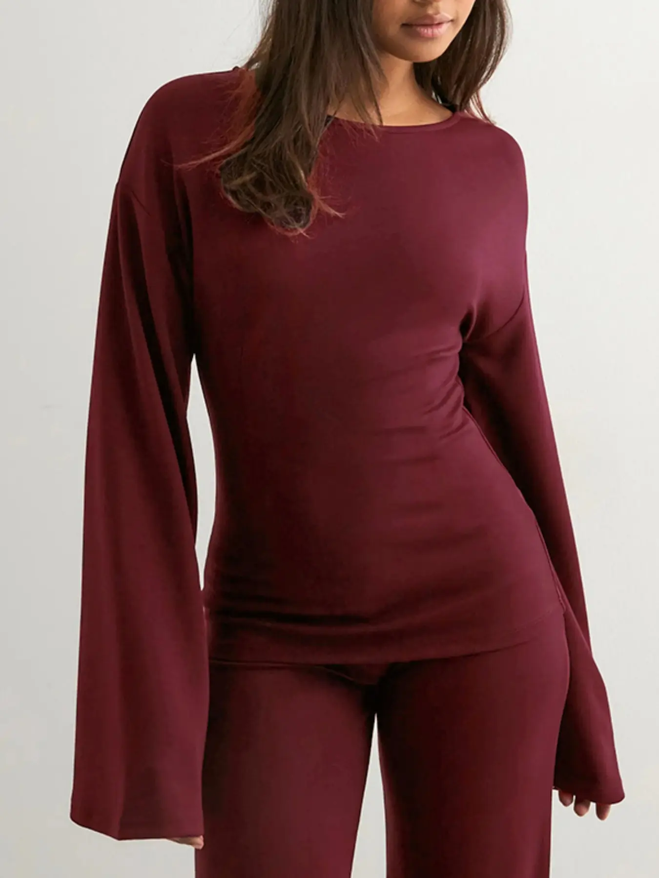 Women's Fashion Solid Color Casual Round Neck Flare Long Sleeve Top & Straight Leg Pants Set, Comfortable Muslim Spring Autumn #pjset #womenspajamas #jumpsuits #christmasloungewear #womenpajamaset #womenssweatshirtset #fashionablewomensclothing #loungewearsets #womensjumpsuit #womens2piecesets