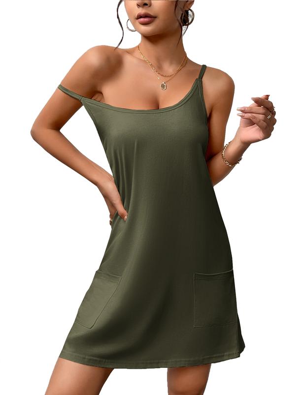 ·【Design】 Womens nightgown with adjustable spaghetti straps, racerback, round neck, above knee length, and oversized patch pockets at front. Perfect for make a fashion look on summer. Furthermore,It has a good draping quality,which can perfectly modifies your figure and hug every curve of your body.