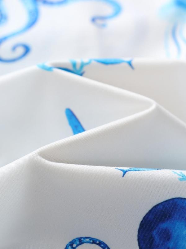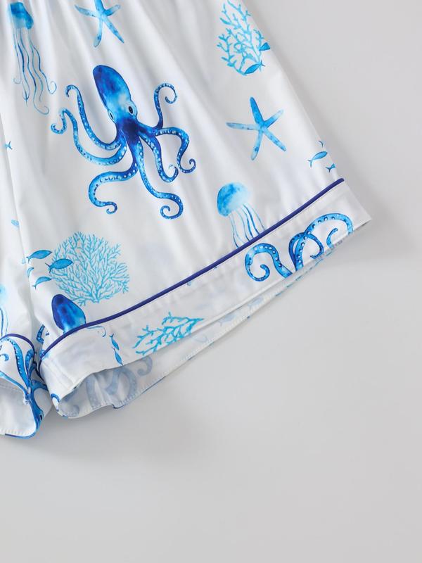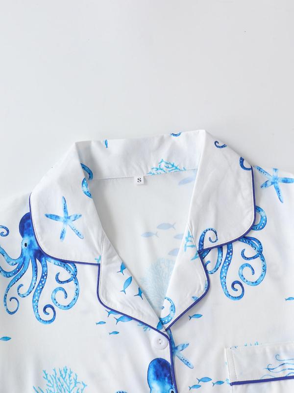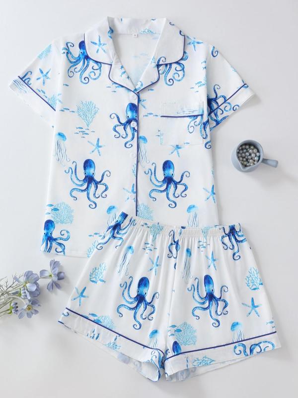 Women's Octopus Print Button Front Shirt & Shorts Pyjama Set, Comfort Two-piece Pj Set for Homewear, Women's Sleepwear for All Seasons, Womenswear, Summer Sleepwear Set