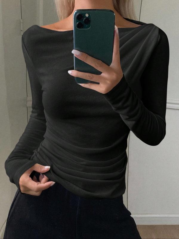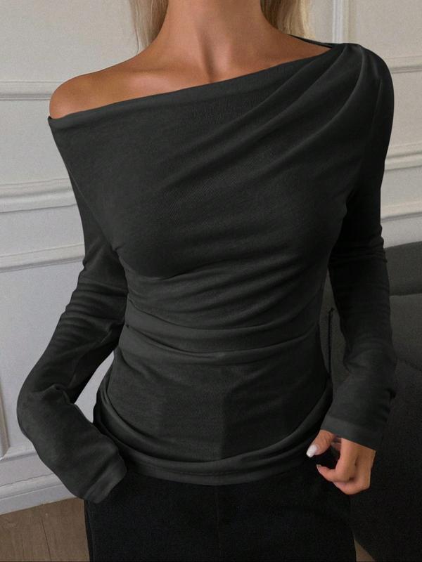 Women's off Shoulder Long Sleeve Top, Loose Fit Asymmetrical Neck Shirt, Casual Elegant Spring & Fall Fashion