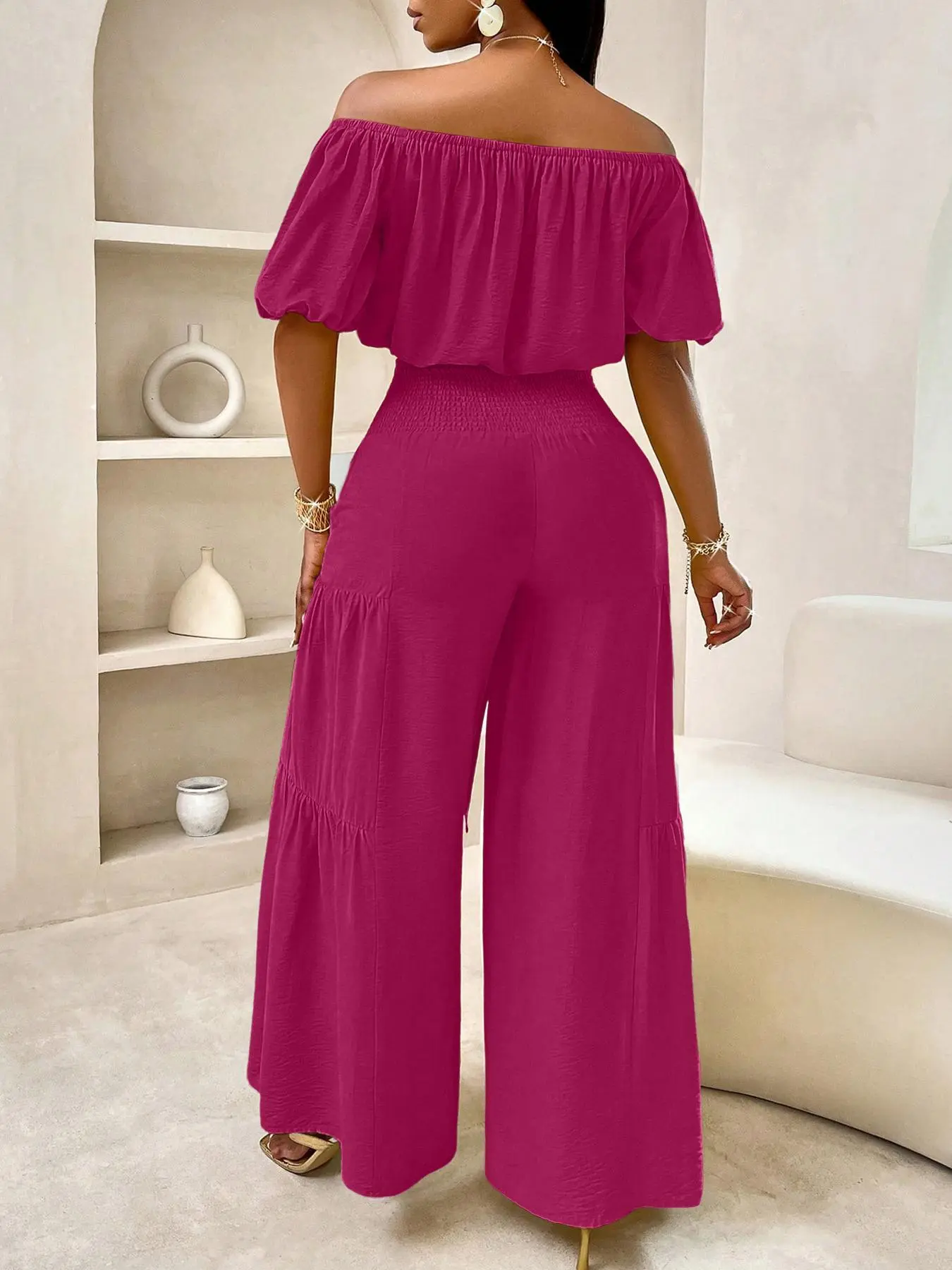 5. Summer Beach Vacation Bow Shoulderless Round Neck Shirt Wide Leg Pants Set, Casual Plain Design, All Seasons Wear, Women's Fashion