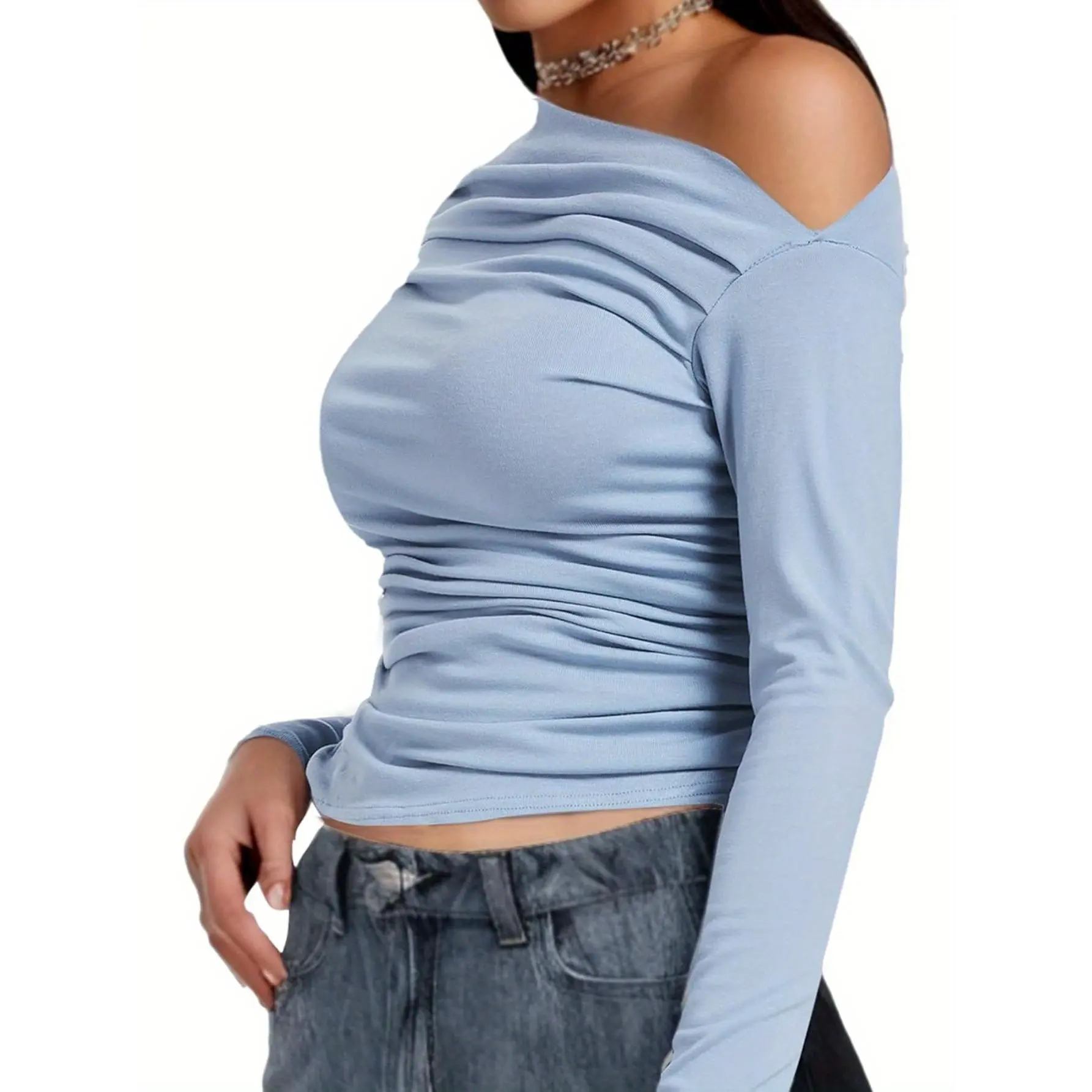 Off The Shoulder Tops for Women Trendy Summer Casual Long Sleeve Solid Color Ruched T Shirts Blouse