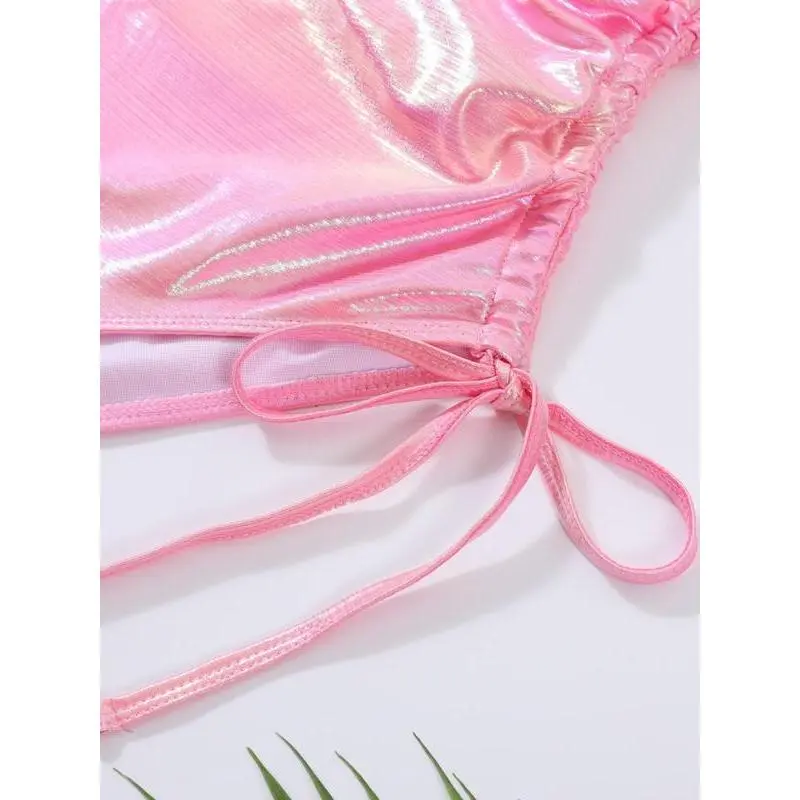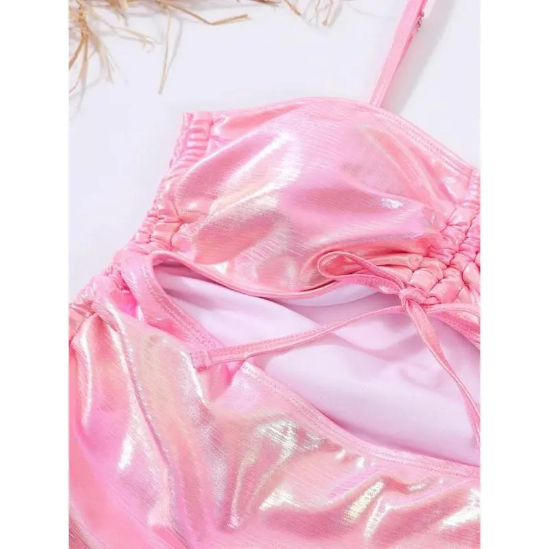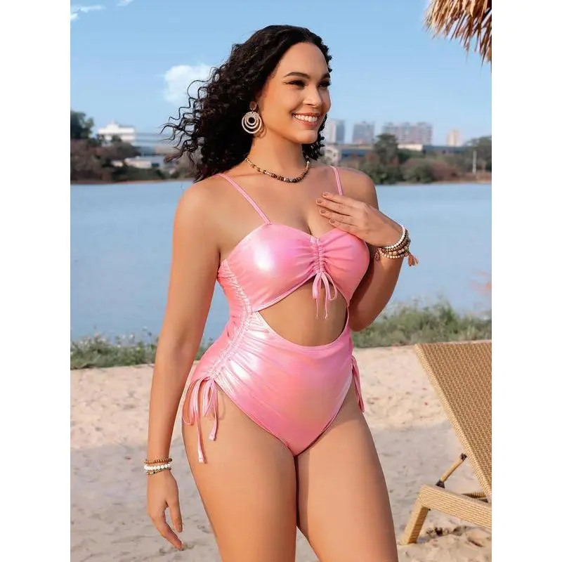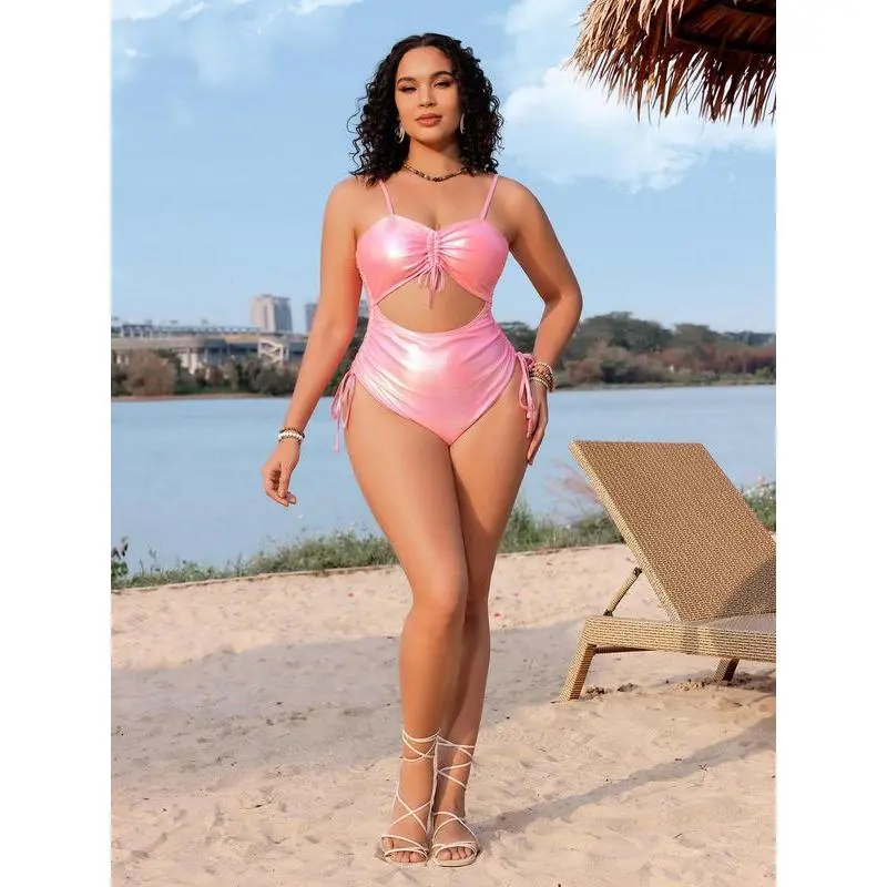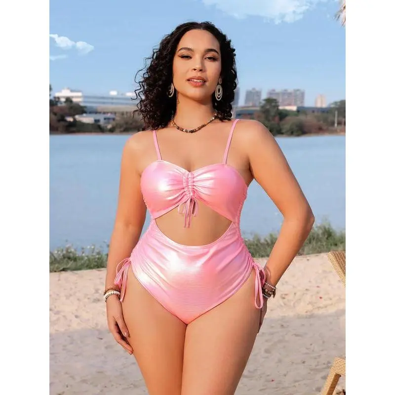 ��Plus Size��: Designed to fit and flatter larger figures. ��Seamless Comfort��: Crafted with a high-stretch foil fabric, this swimsuit offers a snug yet comfortable fit that moves with your body, ensuring ease of movement without the discomfort of tight seams or elastics. ��Foil Fabric��: Adds a shiny effect for a standout look. ��Flattering Design��: The swimsuit boasts a sweetheart neckline and cut-out feature that accentuates the figure, while the ruched detail adds a touch of elegance, enhancing the wearer's natural curves. ��Convenient Wearability��: The combination of a drawstring closure, ruched fabric, and machine washable material makes this swimsuit a practical choice for beach holidays and poolside lounging.