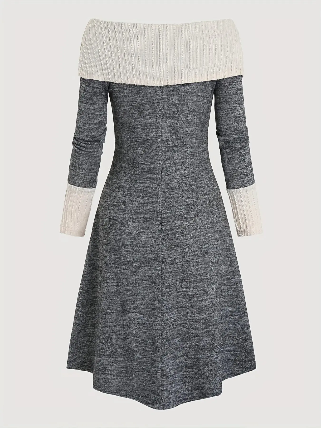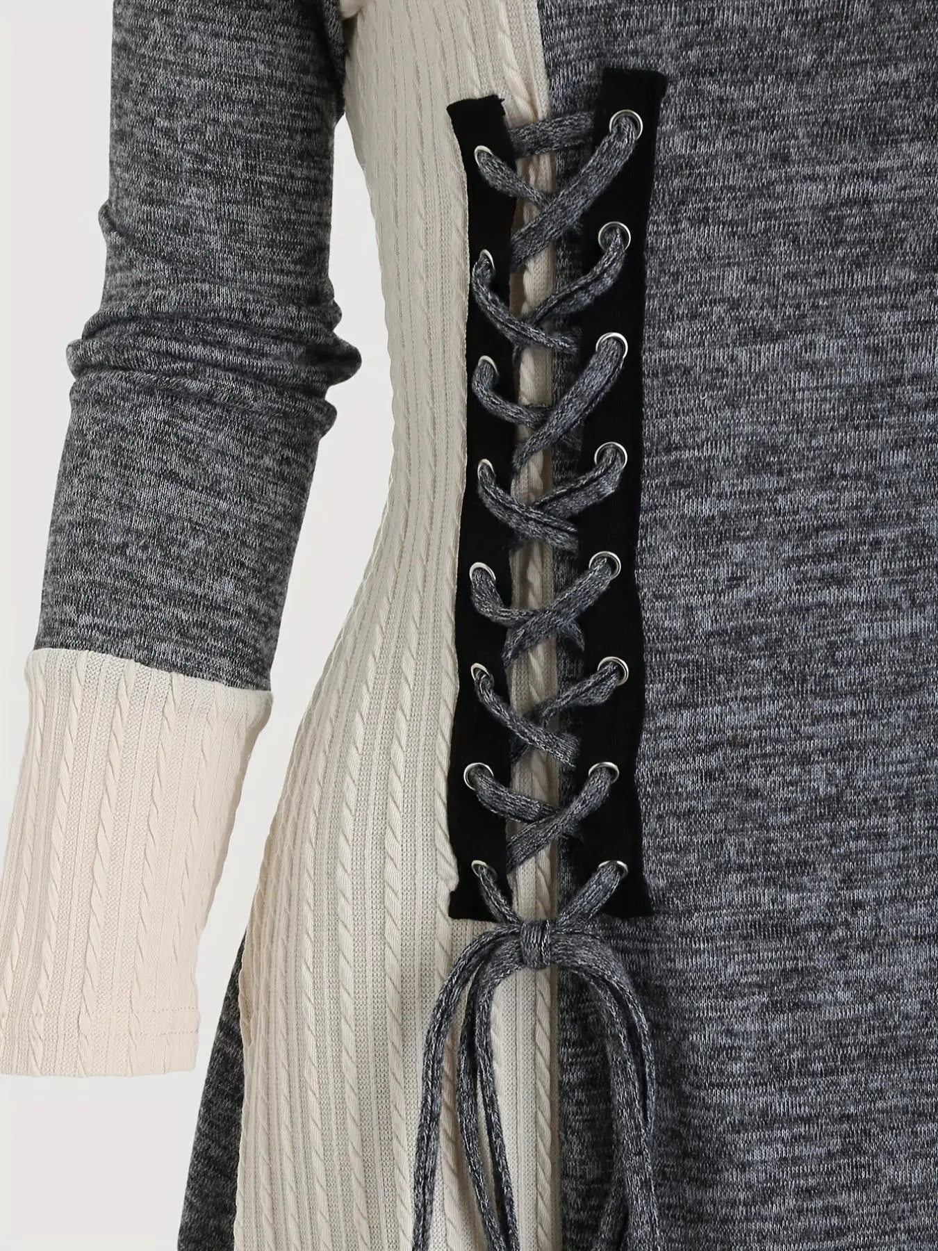 Women's Colorblock Lace Up Off Shoulder Dress, Casual Grommet Eyelet Long Sleeve A Line Dress for Fall & Winter, Women's Clothing for Daily Wear
