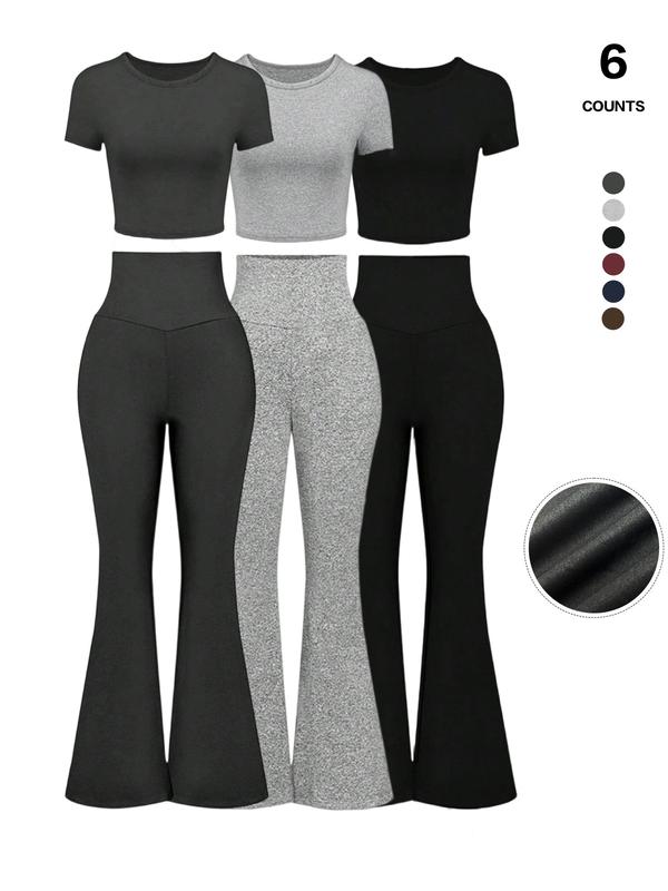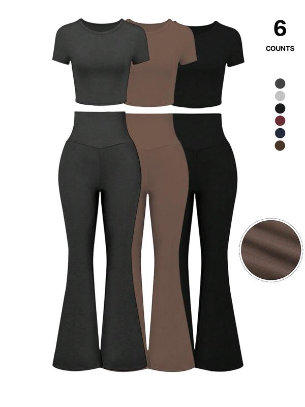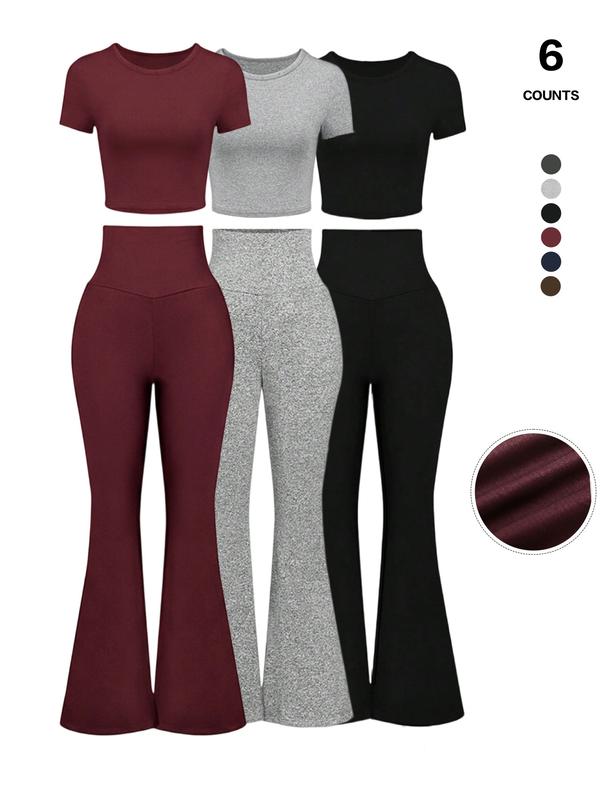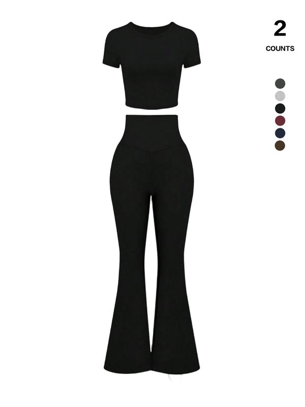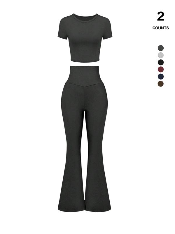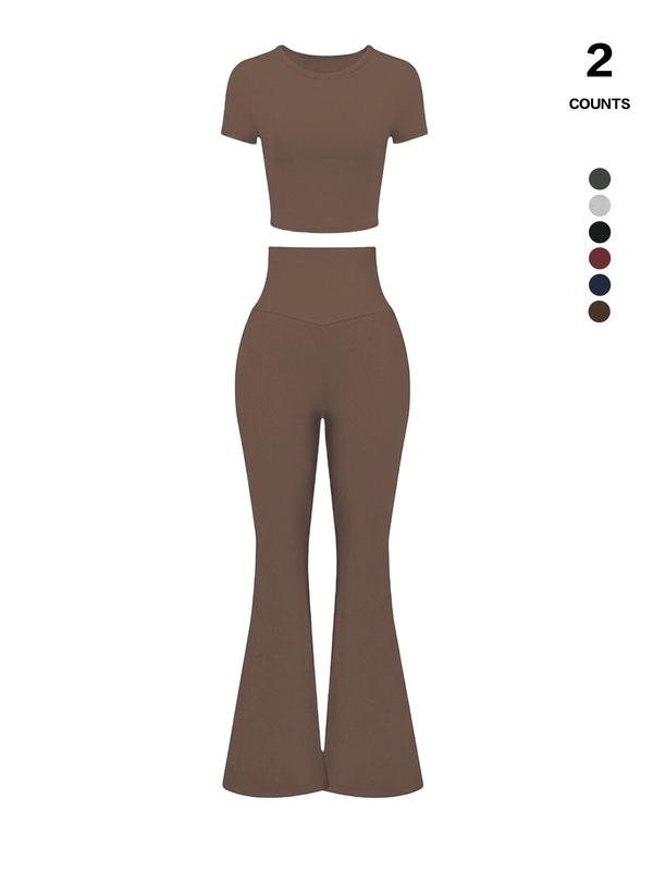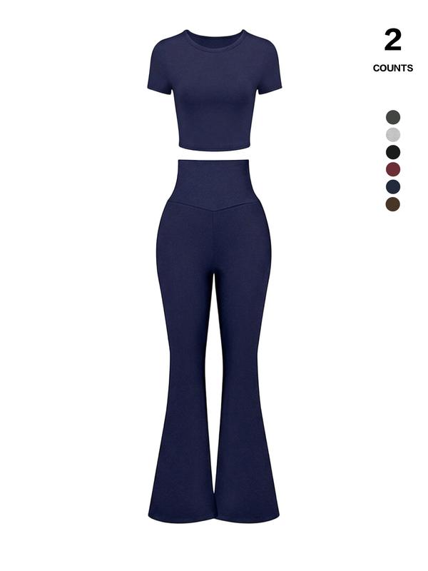 Women's Solid Loungewear Set, Casual Short Sleeve Crop Top & High Waist Flare Leg Pants, Ladies Sleepwear for All Seasons, Pajama Set