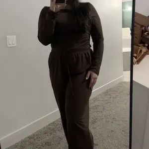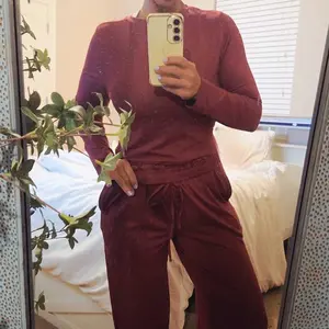 Cute and cozy! Great fit. The top is cropped so it’s shorter, the pants go up pretty high waisted. So comfy and I hate when I have to wash it cause I want to wear it everyday.