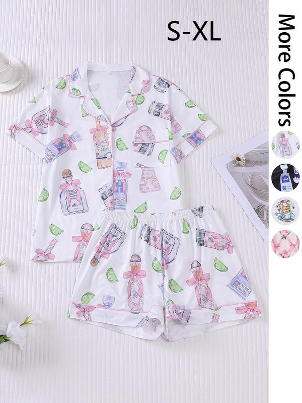 Women's All over Print Lapel Shirt & Shorts Pajama Set, Casual Comfy Short Sleeve Top & Elastic Waist Shorts, Ladies Summer Sleepwear #10piececomforterset #knitsleepwear #threepiececomforterset #onsiepajamas #womenslingerieset #hanespajamas #teddybearpjset #animesleepwear #loungewearfinds #babygirlpajamas