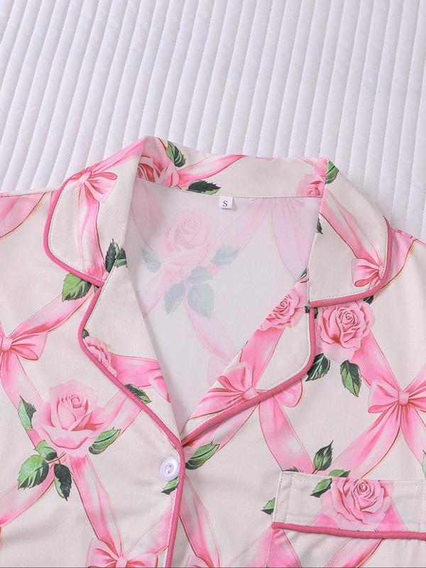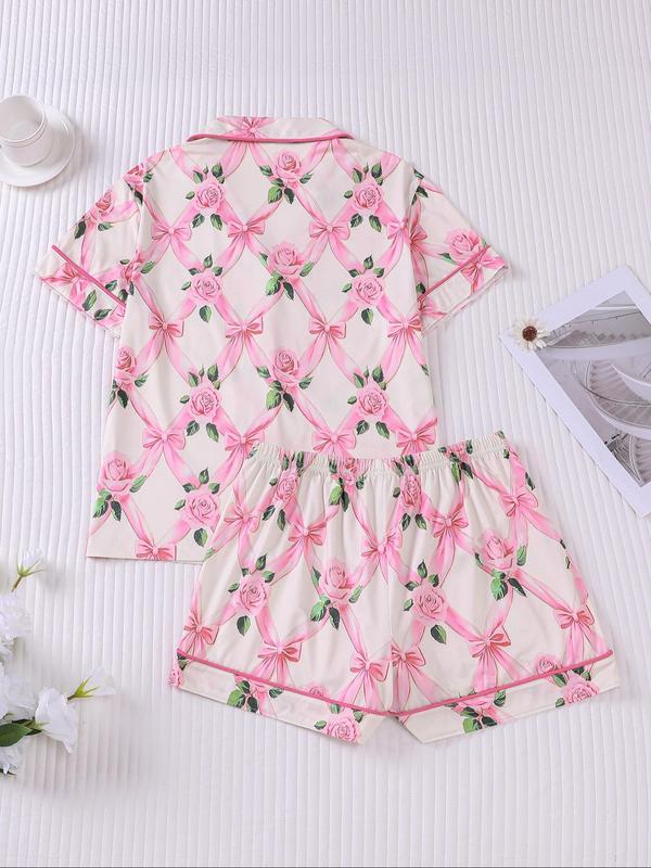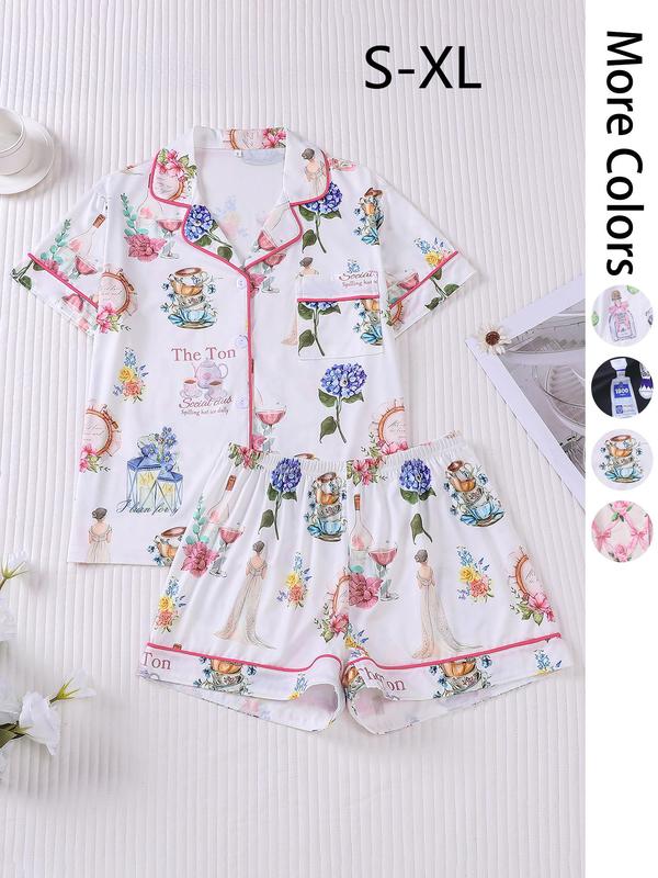 Women's All over Print Lapel Shirt & Shorts Pajama Two-Piece Set, Casual Comfy Short Sleeve Top, Elastic Waist Shorts for Summer Sleepwear #womenssweatshirtset #cozyloungewearset #bamboopajamas #valentinesdaypajamas #sweaterset #pjsets #pjbottoms #prettygardensweatsuit #holidaypjs #sleepwearforwomen